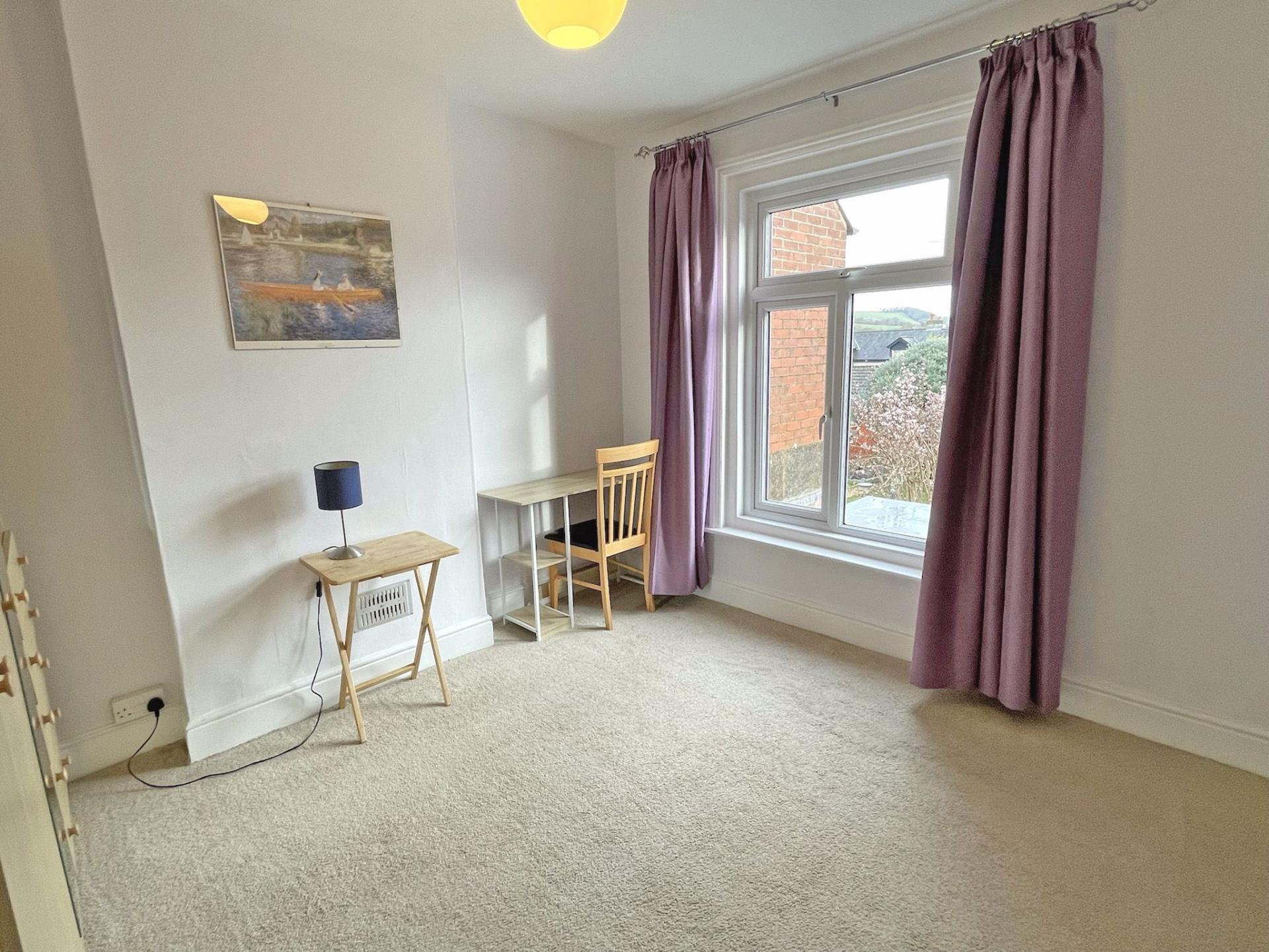 2.94m x 2.92m (9’08” x 9’07”) uPVC double-glazed window to the rear aspect and with a pleasant outlook towards Trow Hill and the surrounding hills. Built-in cupboard, internal shelving and hanging rail. Radiator. Carpet. Curtains.