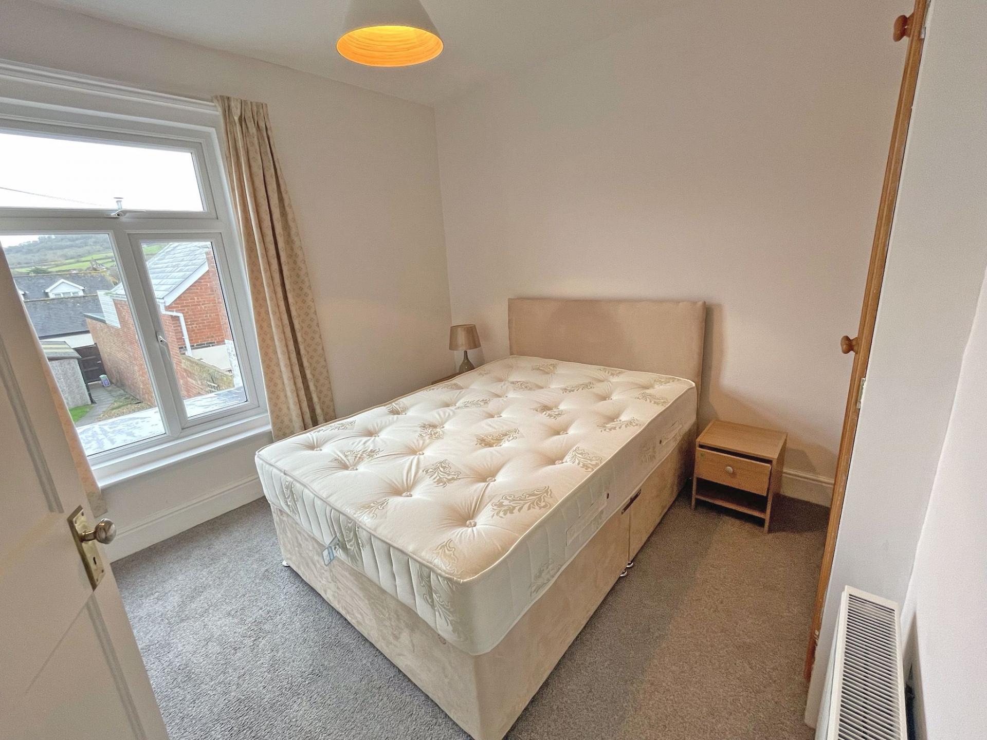 3.08m (maximum dimension into chimney alcove) x 3.29m (10’01” x 10’09”) uPVC double-glazed window with a pleasant outlook over the rear and enjoying fine views towards Trow Hill. Curtains. Radiator. Carpet. Double bed. Pine coloured range of wardrobes with integrated chest of drawers. Radiator.