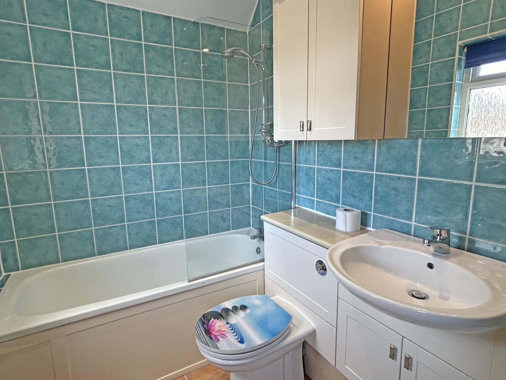 With fully tiled walls in a modern choice of tiling with an attractive border. White low level WC. uPVC double glazed window with obscure glass. Laminate flooring.