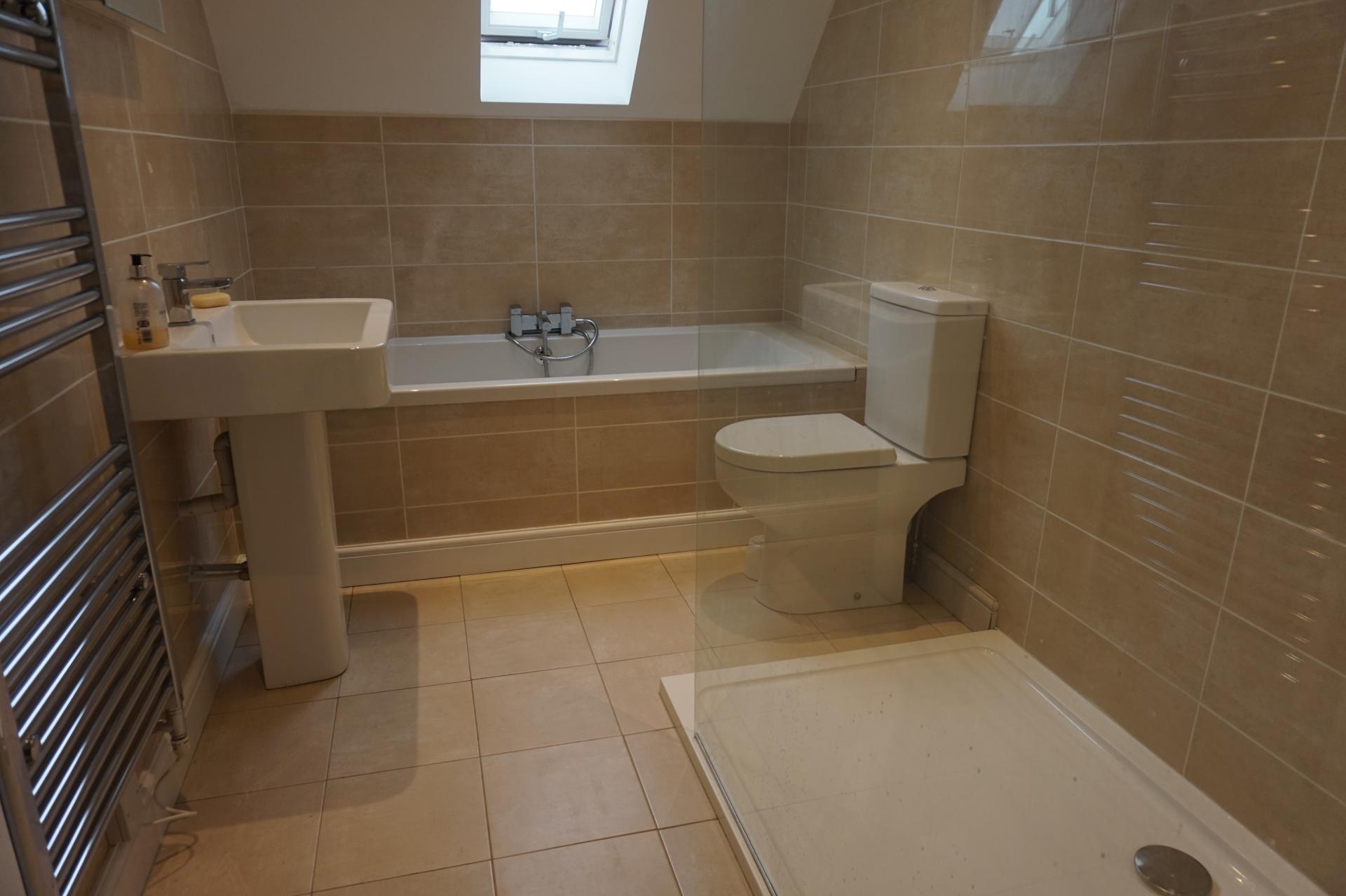 Obscure Velux window. Low voltage downlighters. Fully tiled walls from floor to ceiling in a sandstone high gloss finish tile. A white bathroom suite comprising a large double end bath with bath/shower mixer tap and hand held shower attachment. Low level WC. Pedestal wash basin with illuminated mirror over. Large open ended walk in shower with glass shower screen, fully tiled walls and chrome thermostatic shower valve with rain style shower head and separate hand held shower attachment. Cream tiled floor. Chrome ladder style heated towel rail. Low voltage downlighters. Extractor fan.