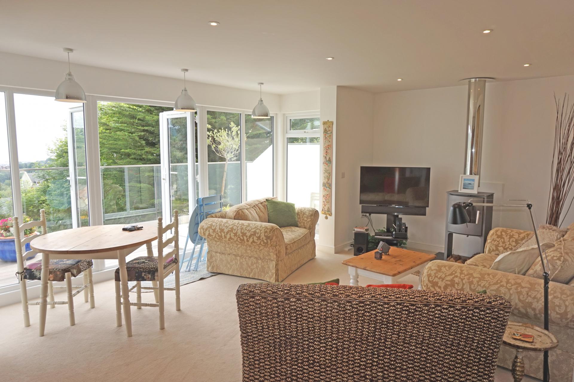 The spacious sitting room, with fully glazed doors, provides access to a stunning first floor balcony with a glass balustrade for uninterrupted views towards Salcombe Hill and the sea beyond.