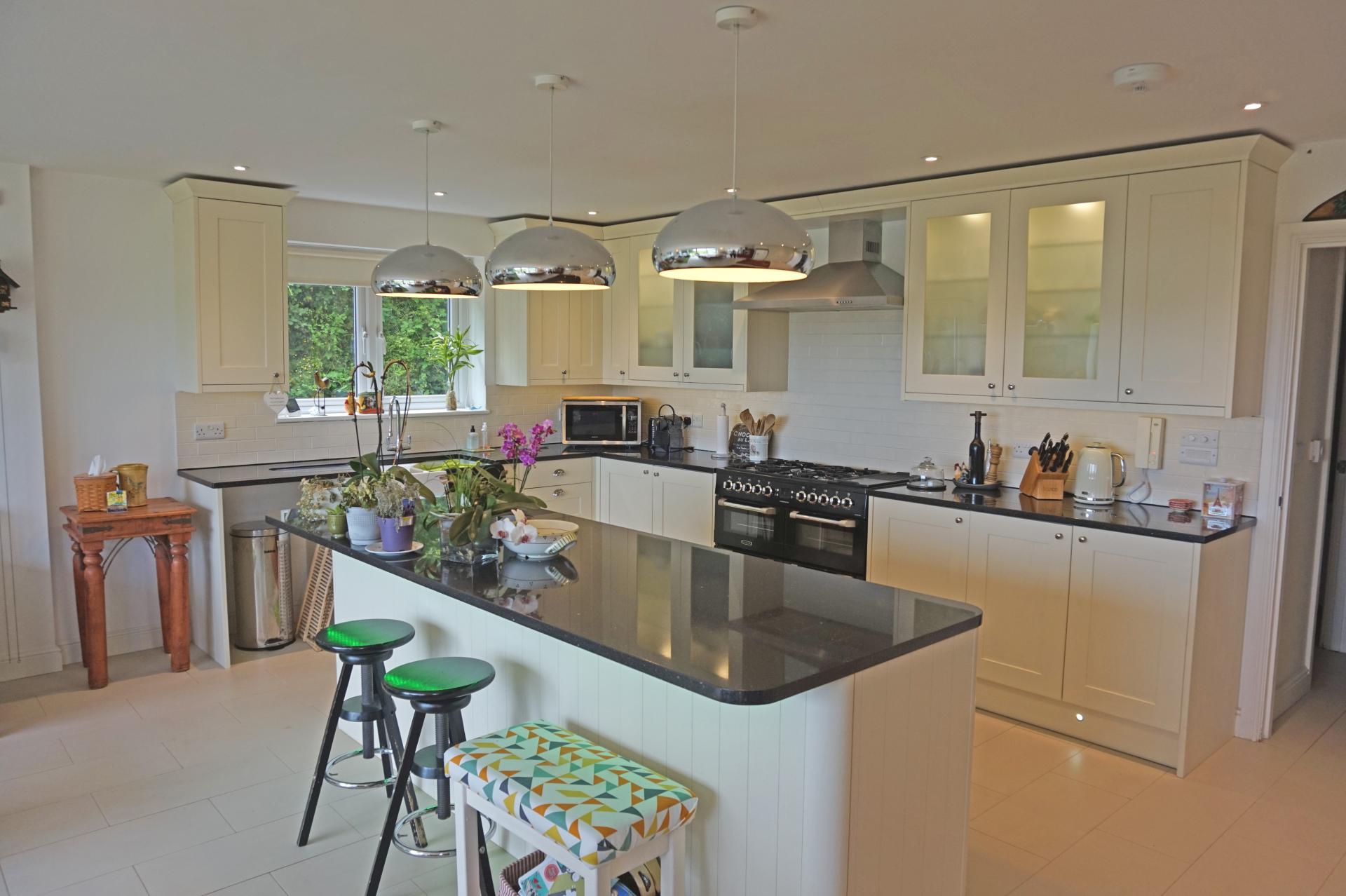 A modern attractively fitted kitchen comprising a range of floor standing and wall mounted cupboards with cream shaker style drawer and door fronts, chrome handles and black granite worksurfaces with cream tiled splashbacks. Large central island with a breakfast bar, a granite top and large storage drawers. Ceramic belfast style sink and granite top, which incorporates a draining surface. Built in range style oven which incorporates a six burner gas hob, hot plate (which also comprises as a griddle) and electric ovens, which comprise of two ovens, a grill and a slow cooker. Low voltage downlighters. Space for a freestanding dishwasher. Cream porcelain tiles throughout the room. Further floor to ceiling kitchen cupboards. Freestanding tower style fridge/freezer.