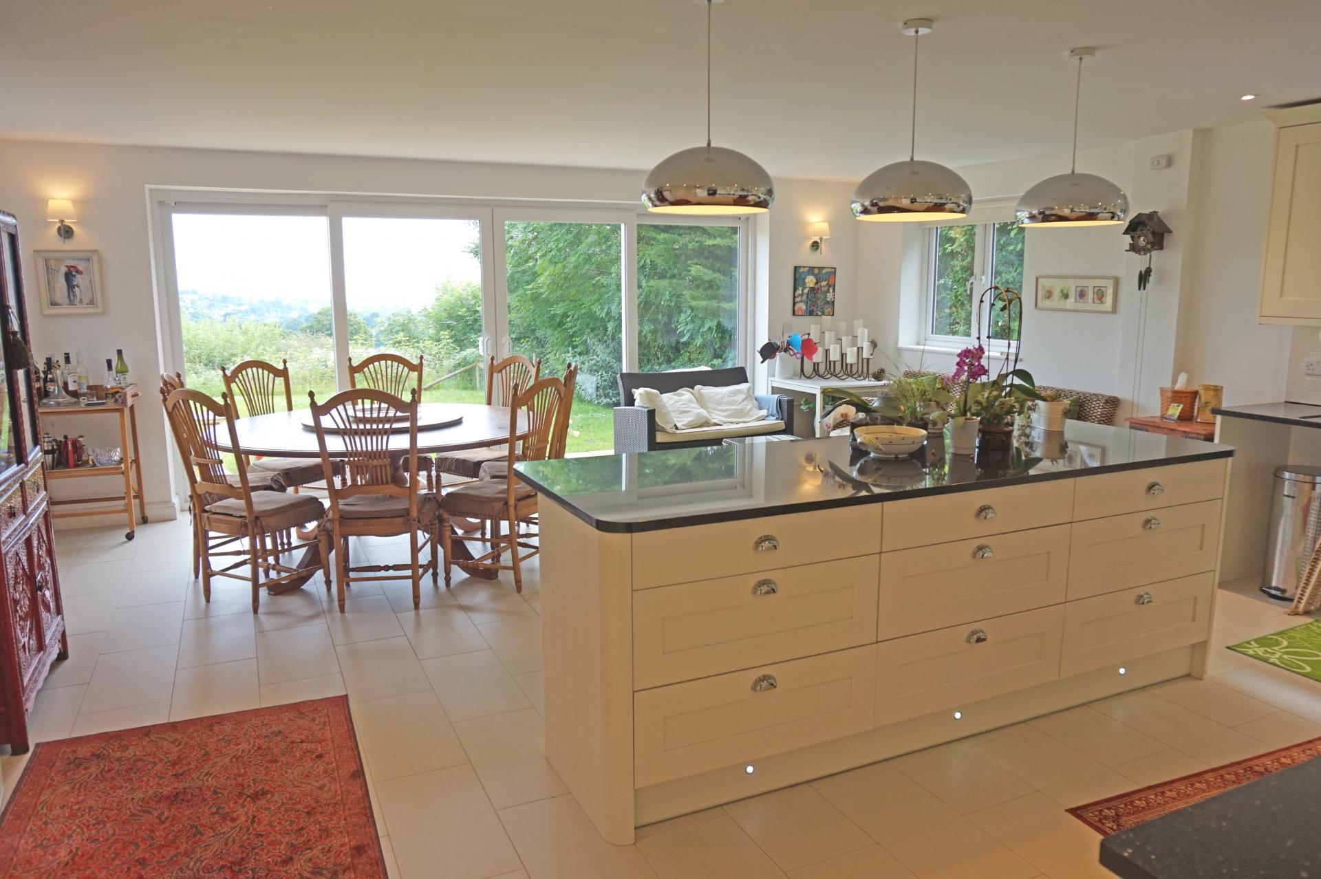 6.62m (21’08) x 6.30m (20’08) An impressive spacious kitchen/diner with a contemporary feel, enjoying superb valley views to the sea beyond. uPVC double glazed sliding doors provide access to a paved terrace and an enclosed level garden laid mainly to lawn. uPVC double glazed windows to the side aspects, with fitted blinds.