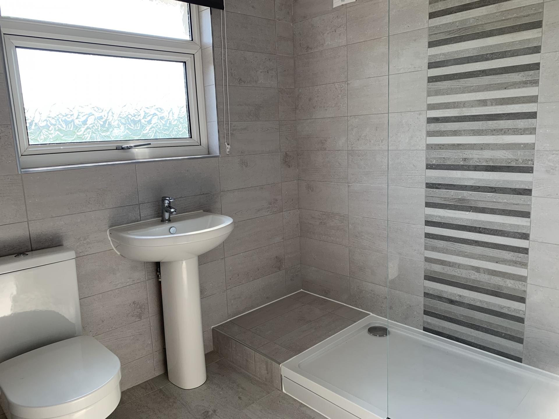 Obscure uPVC double glazed window. Brand new suite comprising WC, wash basin, large, open-ended, walk-in shower with glass screen and chrome finished shower with large, ‘rain-style’ head and hand held rose. Fully tiled walls and floor in matching grey tiling. Chrome, heated towel rail. Extractor.