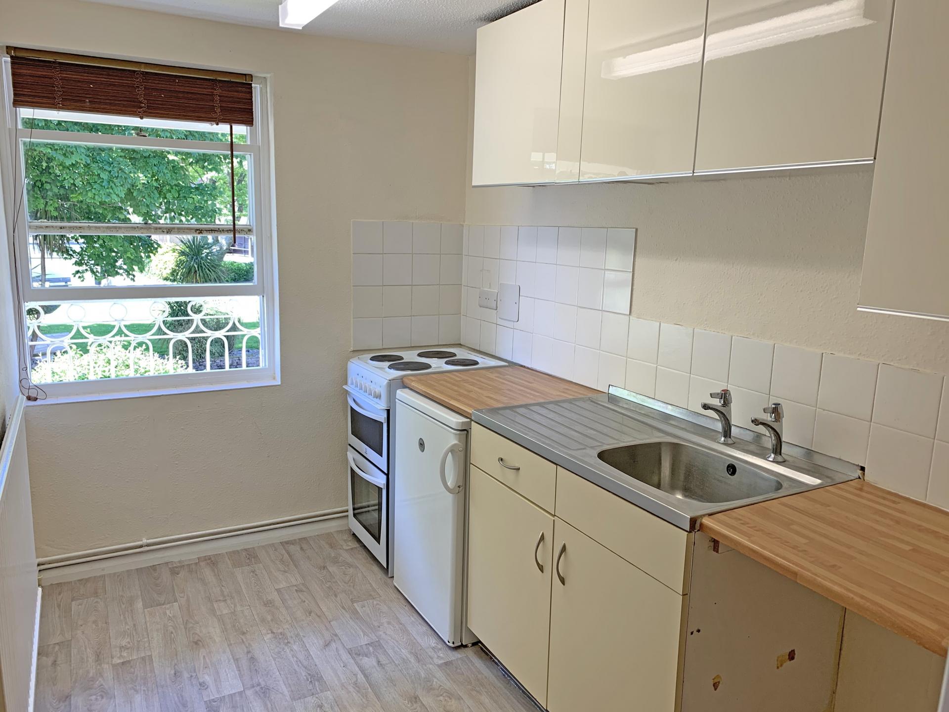 3.24m (10’ 07) x 1.98m (6’ 06) Single glazed window with a pleasant outlook towards The Triangle. Fitted kitchen comprising a range of fitted cupboards with cream drawer and door fronts. Butchers block effect worksurfaces and tiled splash backs. Stainless steel sink incorporating draining unit. Freestanding electric cooker with electric four plate hob. Freestanding under counter fridge with small freezer compartment. Wood effect lino floor covering. Door to pantry cupboard containing fitted shelving. Further door to large airing cupboard with slated timber shelving and wall hung gas fired Worchester boiler for central heating and hot water.