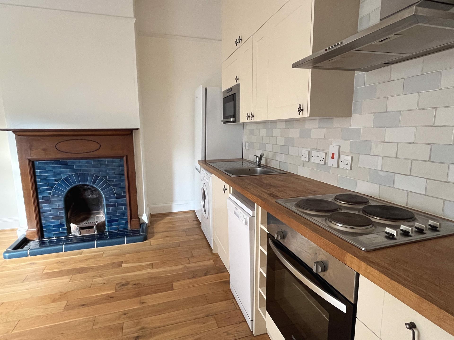 An entrance hall opens into the living space with kitchen area and this enjoys a westerly aspect with Oak flooring, sash, bow window and feature fireplace. The kitchen area is attractively fitted with a range of storage units, having solid wood work surfaces and tiled splashbacks. Fitted appliances comprise electric oven, hob and cooker hood along with a freestanding fridge/freezer, washer drier, slim-line dishwasher and built in microwave.
