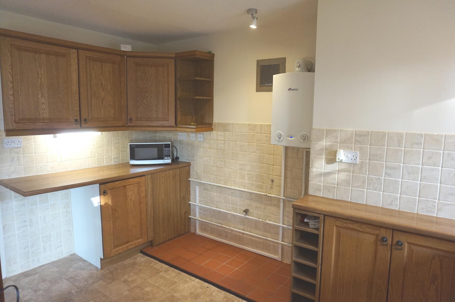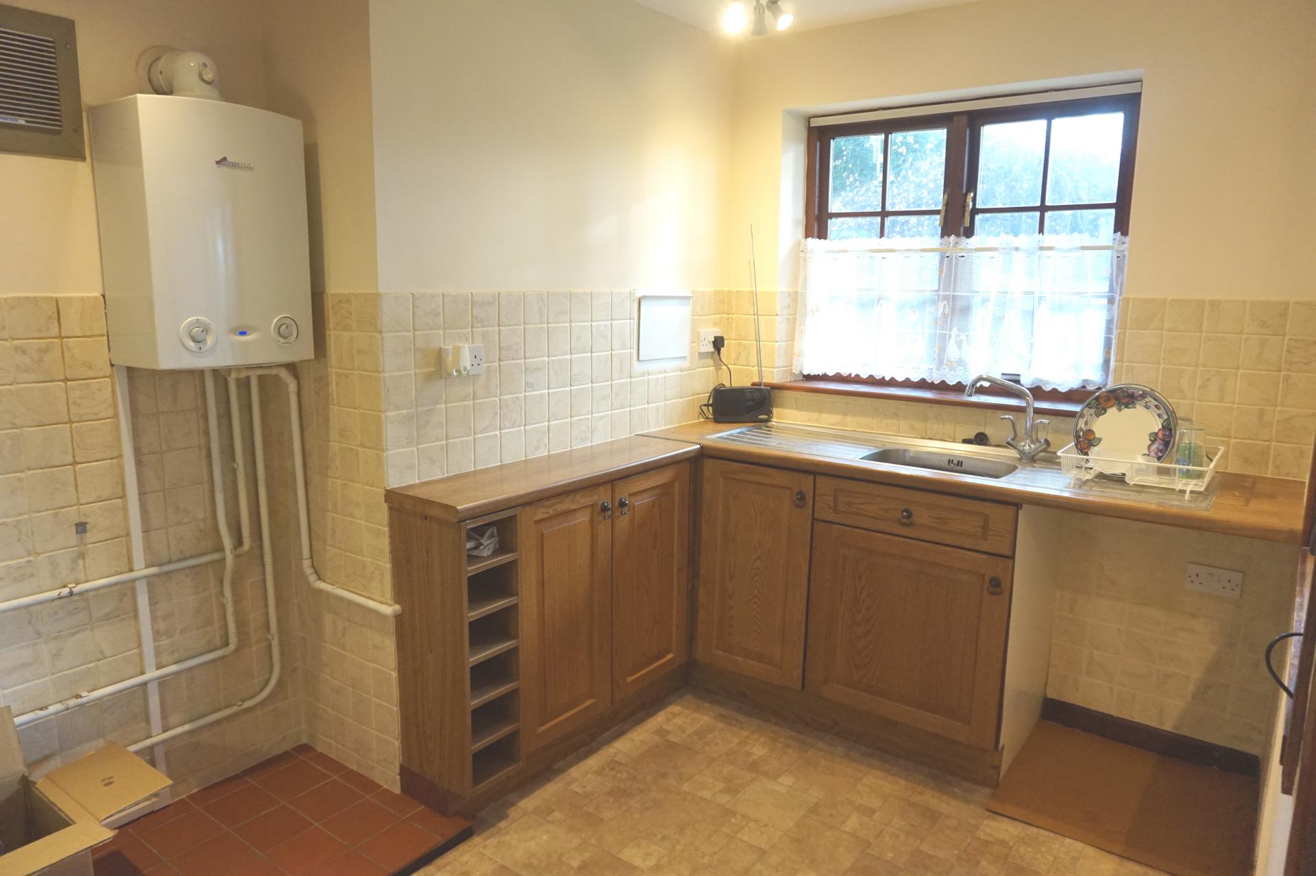 3.88m x 2.35m reducing to 1.91m (12’08 x 7’08 reducing to 6’03) Single glazed window to the rear with a southerly aspect. Fitted kitchen comprising a range of floor standing and wall mounted cupboards with dark wood drawer and door fronts, co-ordinating work surfaces, cream tiled splashbacks, stainless steel sink incorporating double drainer and mixer tap. Space for a free standing gas cooker. Space for an under counter washing machine. Free standing fridge/freezer. Tile effect lino floor covering. Ceiling downlights. Wall hung gas fired Worcester System boiler for central heating and hot water. Door to;