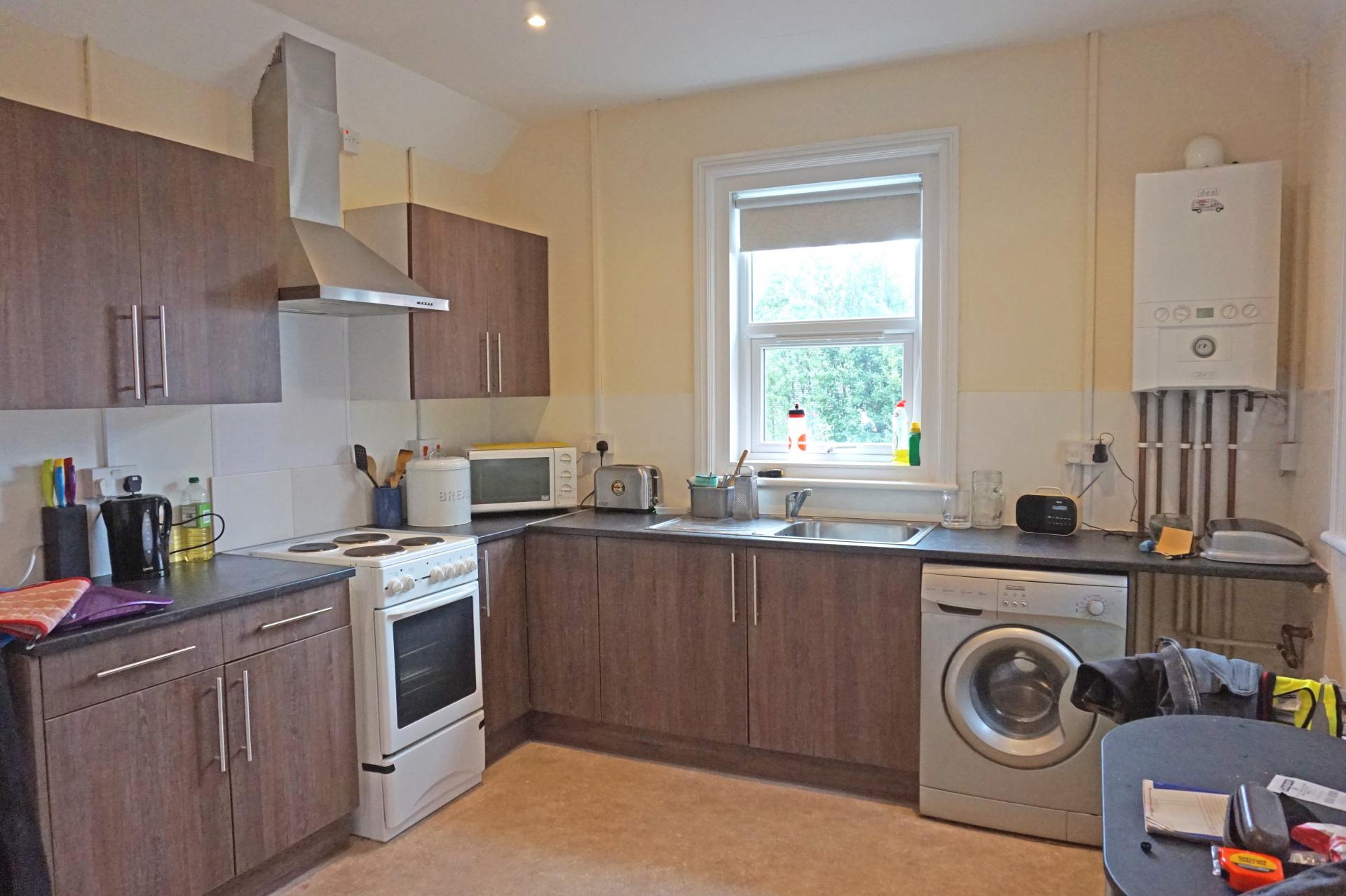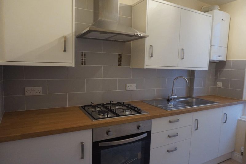 3.19m (10’5”) x 3.65m (11’11”) Three uPVC double glazed windows to the rear and side aspect. Newly fitted kitchen comprising a range of floor standing and wall mounted cupboards with dark wood coloured door and drawer fronts, stainless steel handles, co-ordinated worksurfaces. Stainless steel sink with single drainer. Space for a freestanding electric cooker with stainless steel chimney extractor hood over. Space and plumbing for a freestanding washing machine and space for a freestanding fridge/freezer. Thermostatically controlled radiator. Lino floor covering. Gas fired combi boiler.