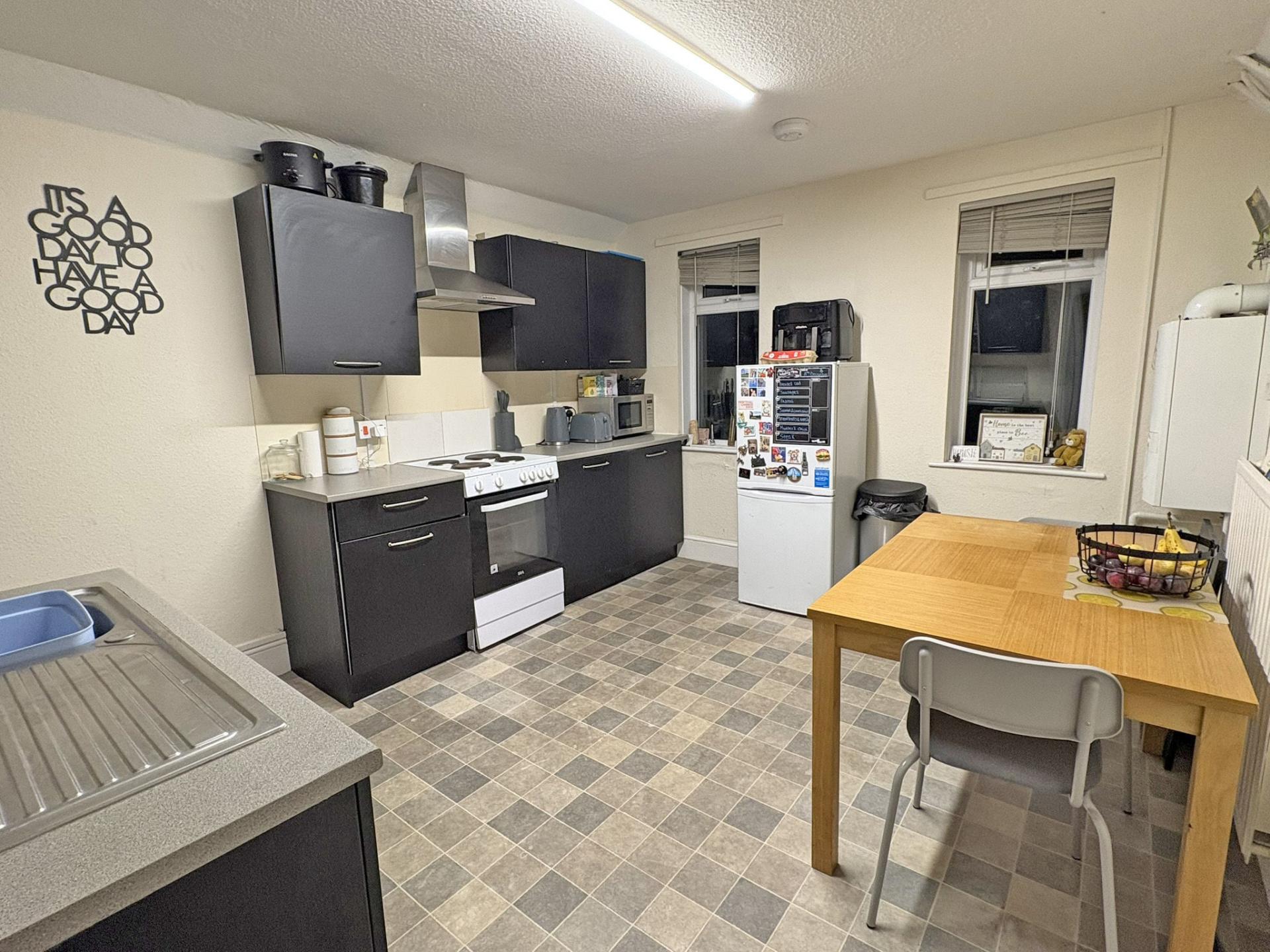 KITCHEN 3.81m (12’06”) x 3.34m (10’11”) With a pair of double glazed sash windows overlooking the rear garden and enjoying a southerly aspect with views to Sidmouth Rugby Ground. A fitted kitchen comprising a range of floor standing and wall mounted cupboards with dark coloured wood doors, chrome coloured handles, grey worksurfaces and white splashbacks. Stainless steel sink with single drainer. Space for electric oven with stainless steel chimney style extractor over. Space for freestanding fridge/freezer. Thermostatically controlled radiator. Ideal gas fired combi boiler. Gas meter and gas isolation valve.