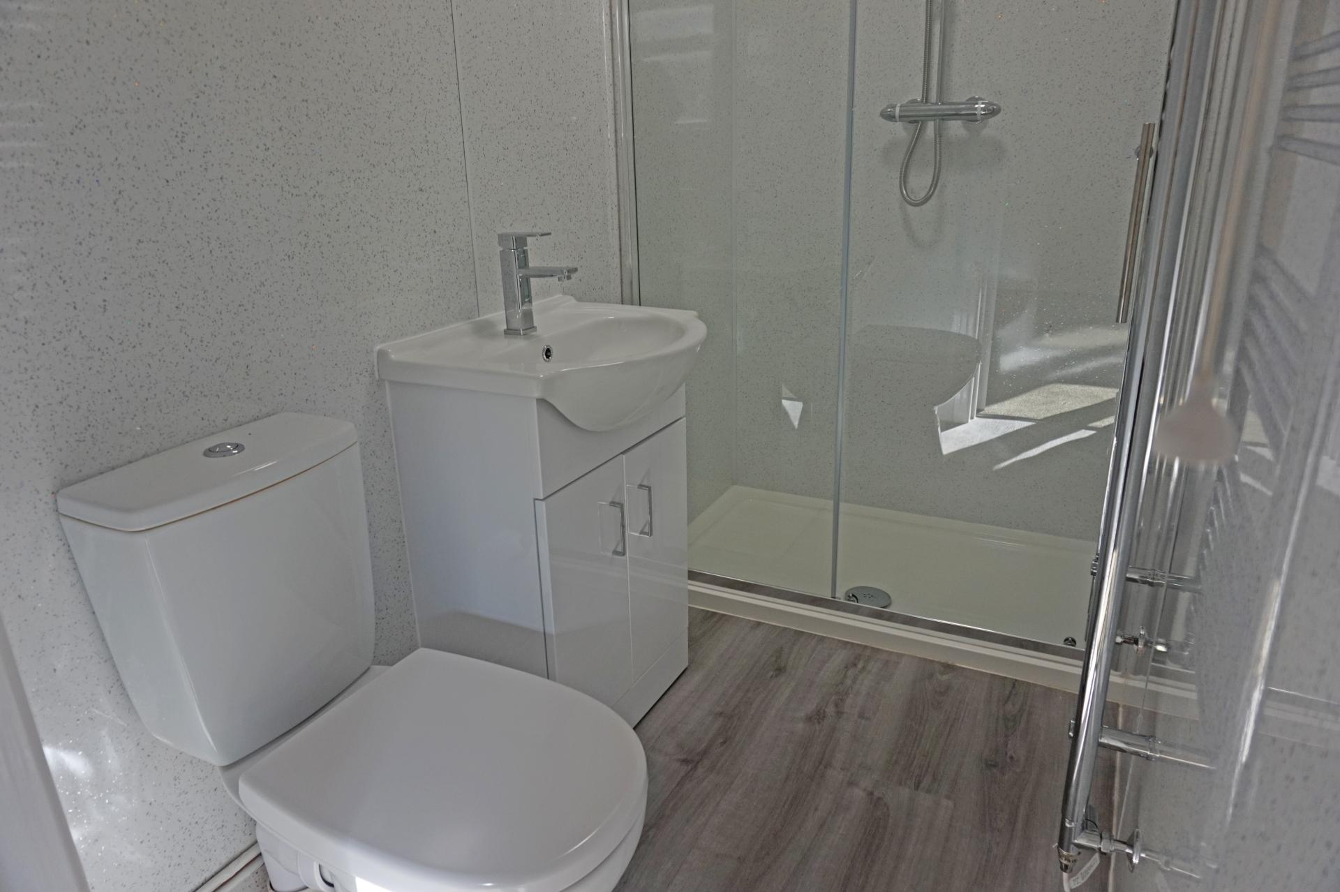 Brand new suite comprising low level WC, wash basin with vanity cupboard below. Fully panelled walls from floor to ceiling in a white, quartz effect. Large shower cubicle with glazed sliding door, fully panelled internal walls. Exposed shower mixer valve with large rain-style head, shower riser rail and shower rose. Wood effect floor covering. Heated chrome ladder-style towel rail. Extractor fan. Light and shaver point.