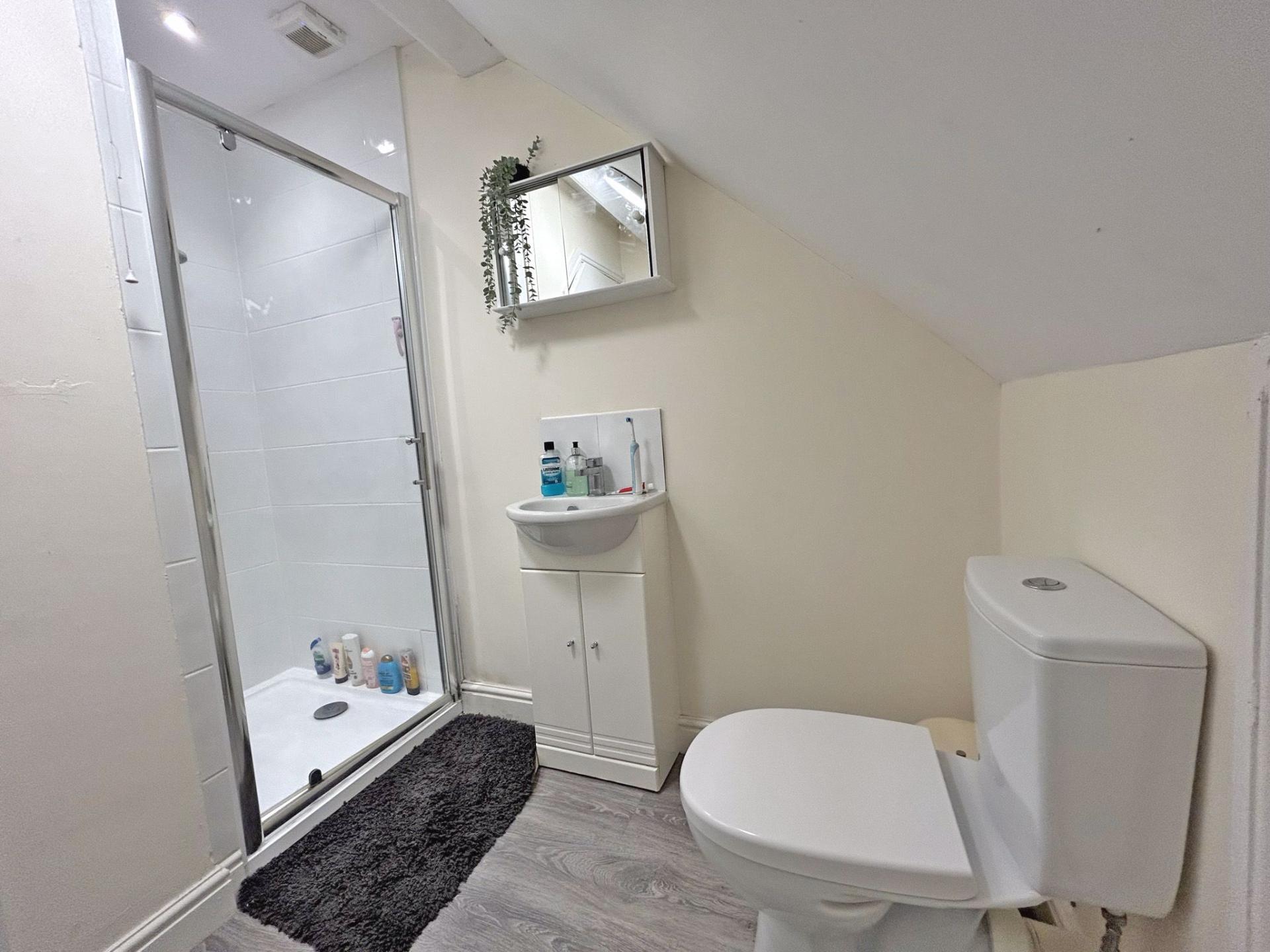 Comprising a white low level WC, white wall hung wash basin with tiled splashback and mirror over and corner shower cubicle with sliding glazed doors, panelled walls and Bristan thermostatically controlled shower with shower attachment and rail. Lino floor covering. Thermostatically controlled radiator. Bathroom extractor.