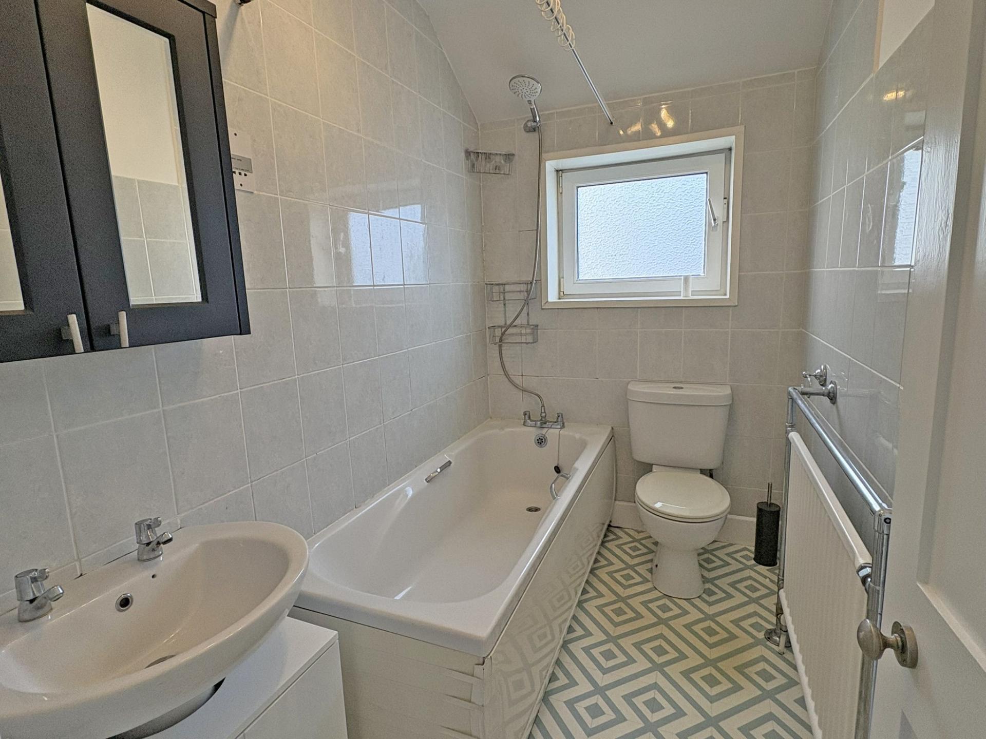 Obscure uPVC double glazed window to the side aspect. White suite comprising WC, pedestal wash basin, panelled bath with bath/shower mixer tap, rose and shower curtain. Radiator/towel rail. Mirror fronted bathroom cabinet. Lino flooring.