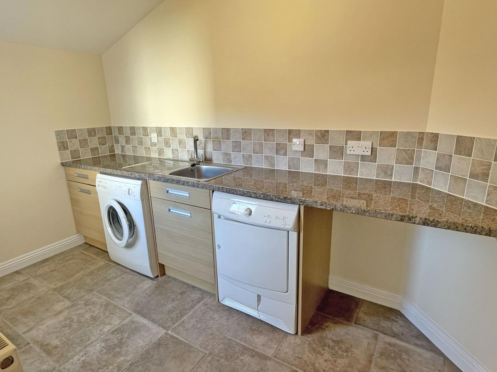 3.84m (12’ 07) x 1.83m (6’) Door to rear garden. Tiled floor. Radiator. Floor standing cupboards with high gloss work surface. Stainless steel sink with mixer tap. Free standing washing machine. Condensing tumble drier. Extractor fan.