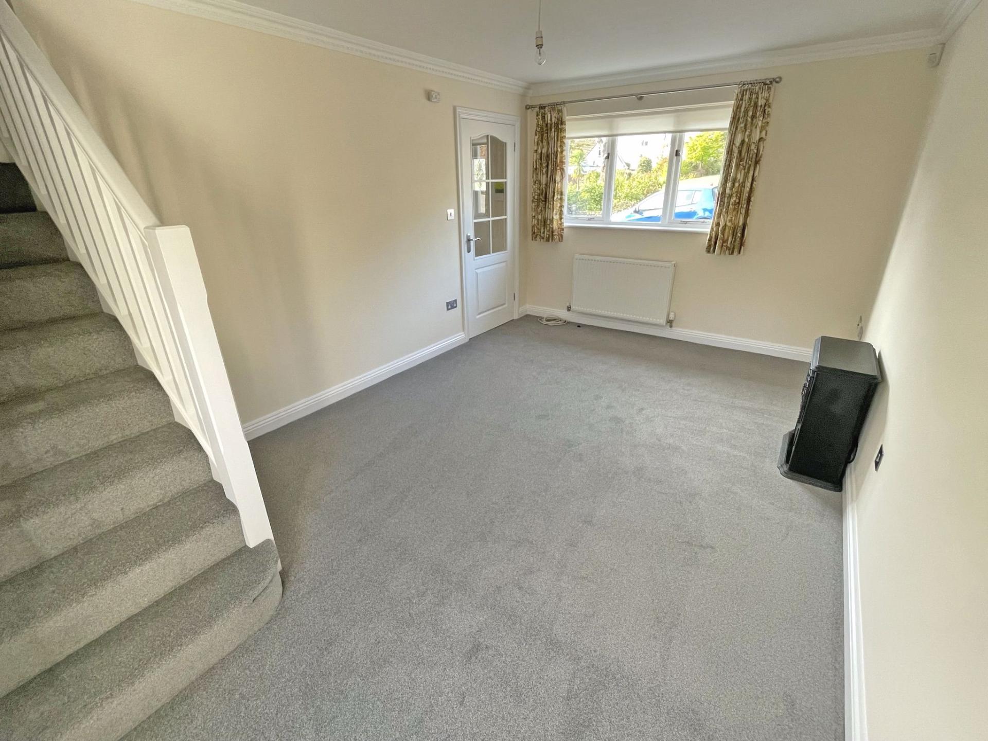 4.76m (15’07) x 3.09m (10’ 02). Window to front aspect. Roller blind. Curtain pole. Door to rear garden. Radiator. TV point. Telephone point. Free standing electric fire. Carpet. Carpeted staircase with bannister and handrail to: