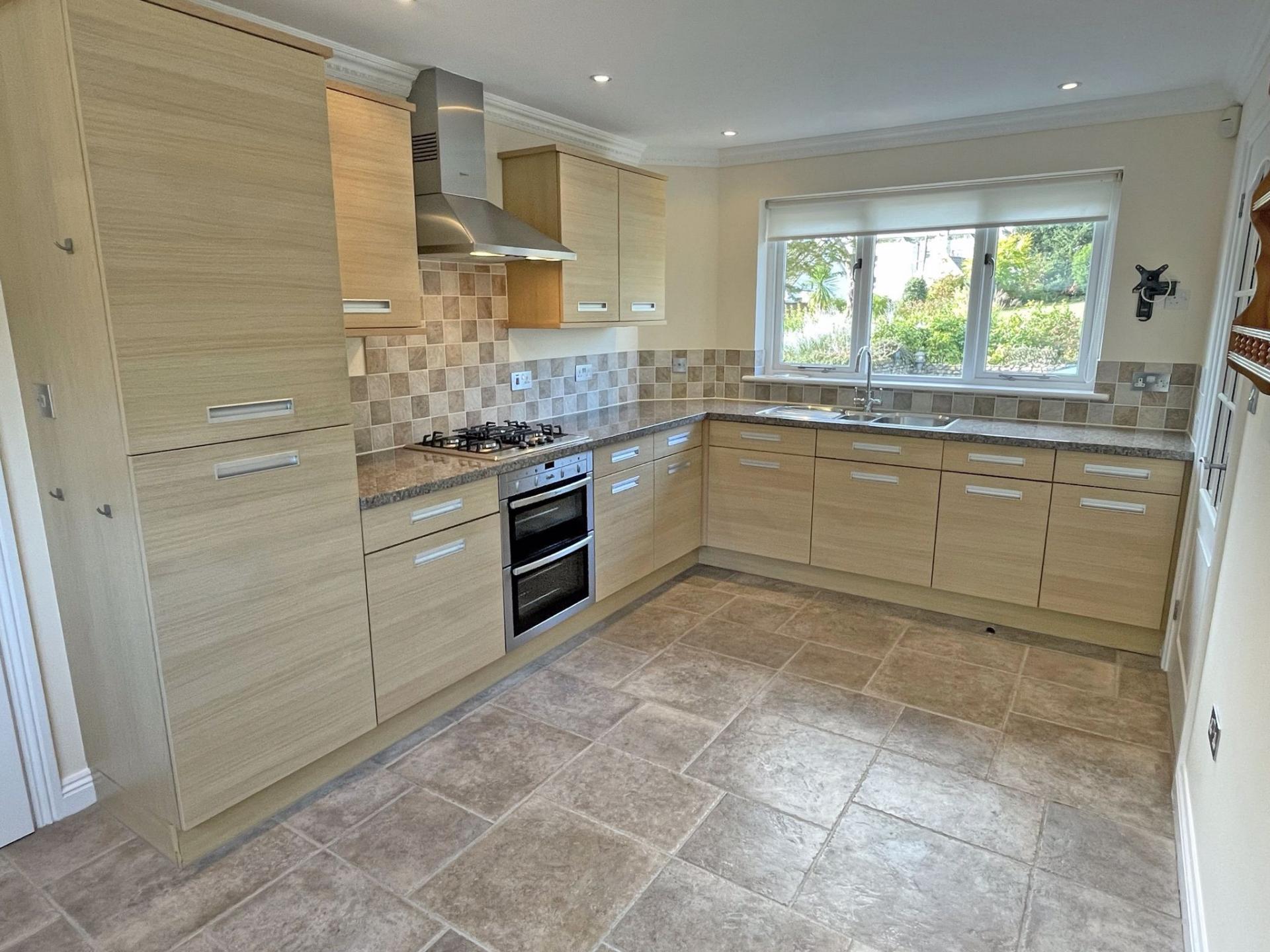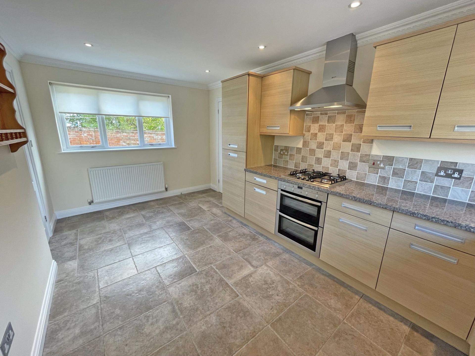 4.75m (15’ 07) x 2.86m (9’ 04). Double glazed windows with dual aspect to front and rear, both with roller blinds. Modern fitted, L-shaped kitchen comprising a range of floor standing and wall mounted units with Oak effect door & drawer fronts, coordinating high gloss work surfaces and tiled splashbacks. Stainless steel one and a half bowl sink with mixer tap. Built-in under counter electric, double oven. Four burner gas hob. Stainless steel cooker hood. Integrated fridge/freezer and dishwasher. Tiled floor covering. TV point. Radiator. Door to: