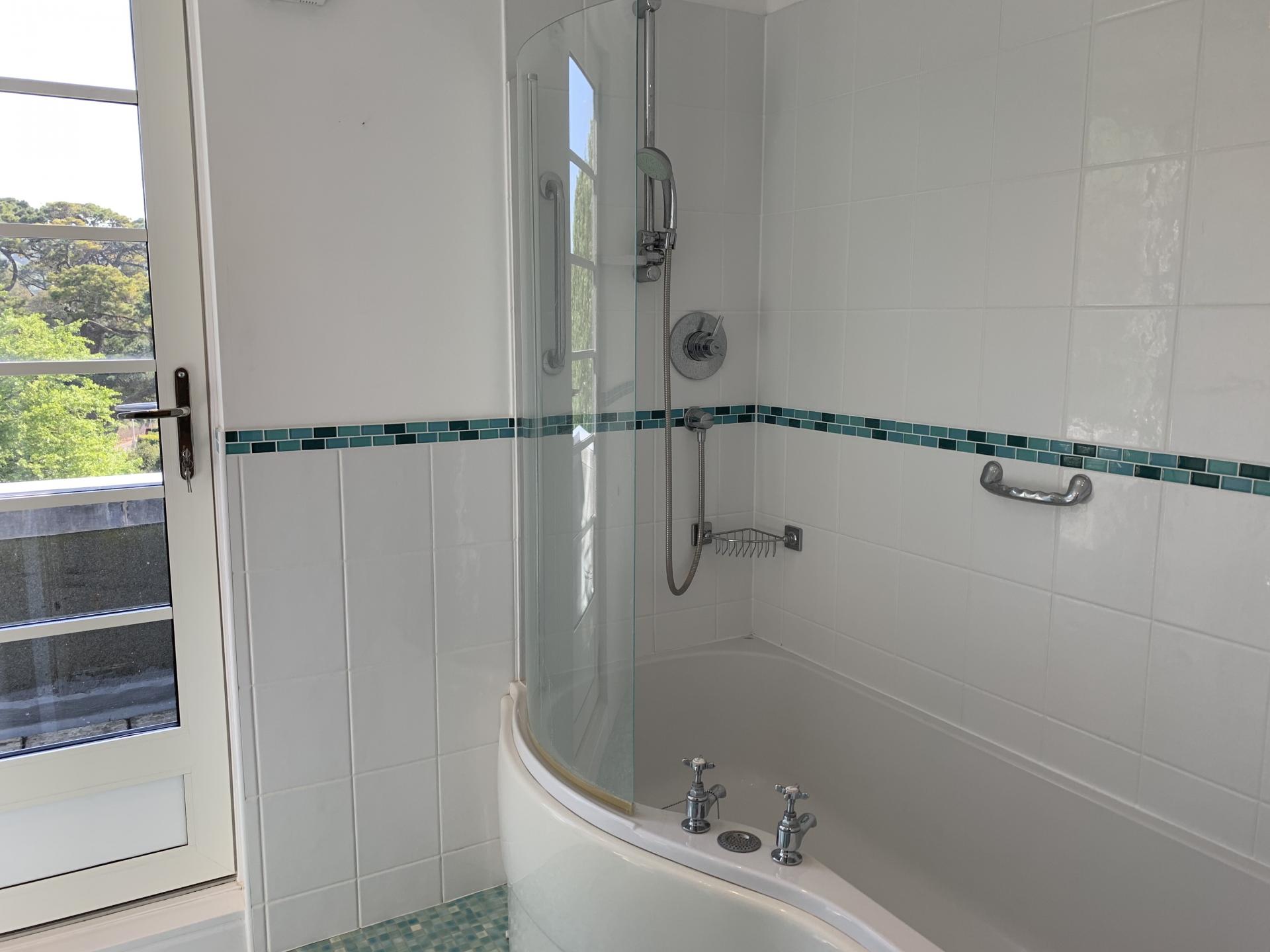 A modern attractively fitted suite comprising of a white p-shaped bath with curved shower screen. Fully tiled walls with white tiling and glass mosaic border. Grohe thermostatically controlled shower with rose and rail. WC. Pedestal wash basin. Light and shaver point with pivoting mirror. Vinyl floor covering. Radiator. Inset ceiling spotlights. Worcester gas fired combi boiler for central heating and hot water. Extractor fan. Glazed door leading to a FURTHER BALCONY with a hand rail, a tiled floor and views over the valley in an easterly direction.