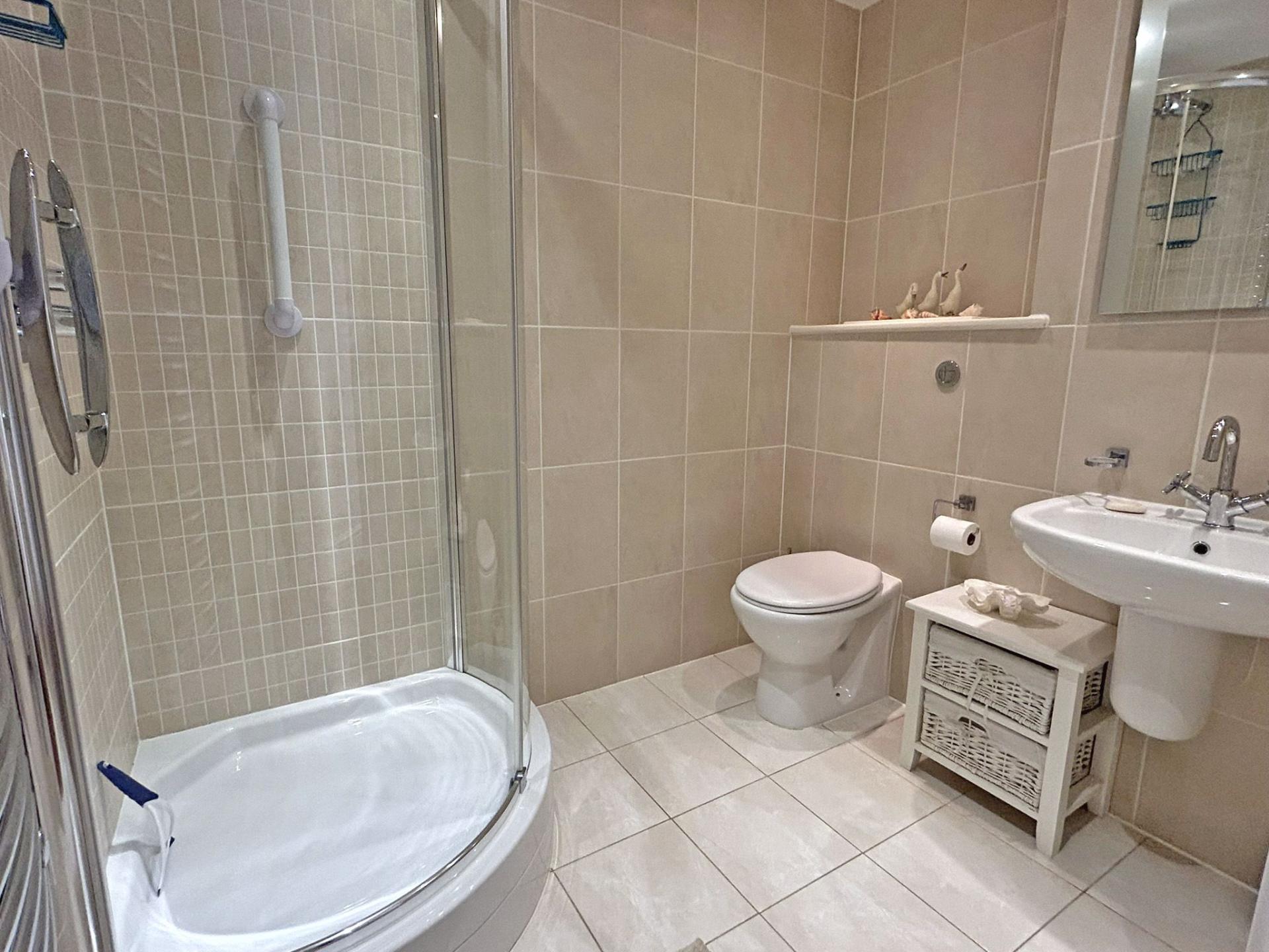 a door to the SHOWER ROOM With fully tiled walls and floor. WC with concealed cistern. Wall hung wash basin. Quadrant shower cubicle with sliding door. Exposed shower mixer valve and ‘rain style’ shower head. Chrome heated towel rail. Shaver point. Mirror. Ceiling down lights. Ceiling extractor.