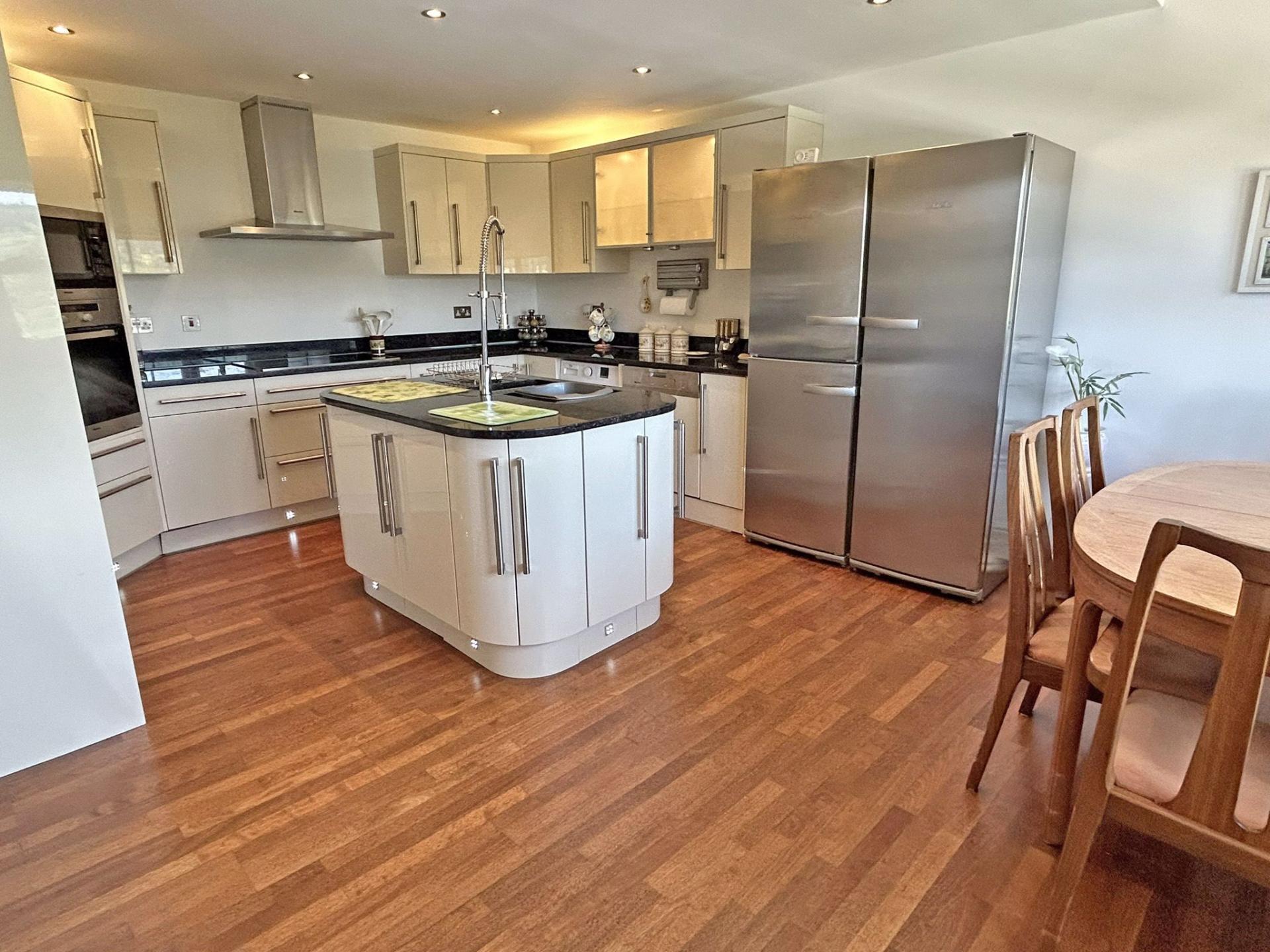 5.48m (17’11) x 3.90m (12’09) Part vaulted ceiling. Double glazed sash windows with views in a westerly direction. Fitted Blinds. Fitted kitchen comprising a range of floor and wall mounted cupboards with cream glass door and drawer fronts. Stainless still handles and co ordinating granite worksurfaces. Central island incorporating cupboards with granite top. One and a half bowl stainless steel sink with drainer and mixer tap. A range of Miele integrated appliances comprising electric oven, microwave, induction hob, cooker hood, steam oven, coffee machine, dishwasher, freestanding washing machine and American style fridge/freezer. LED ceiling downlights. Wood flooring. Heating room stat. Door entry access control panel. Cupboard containing Alfa gas fired combi boiler for heating and hot water.