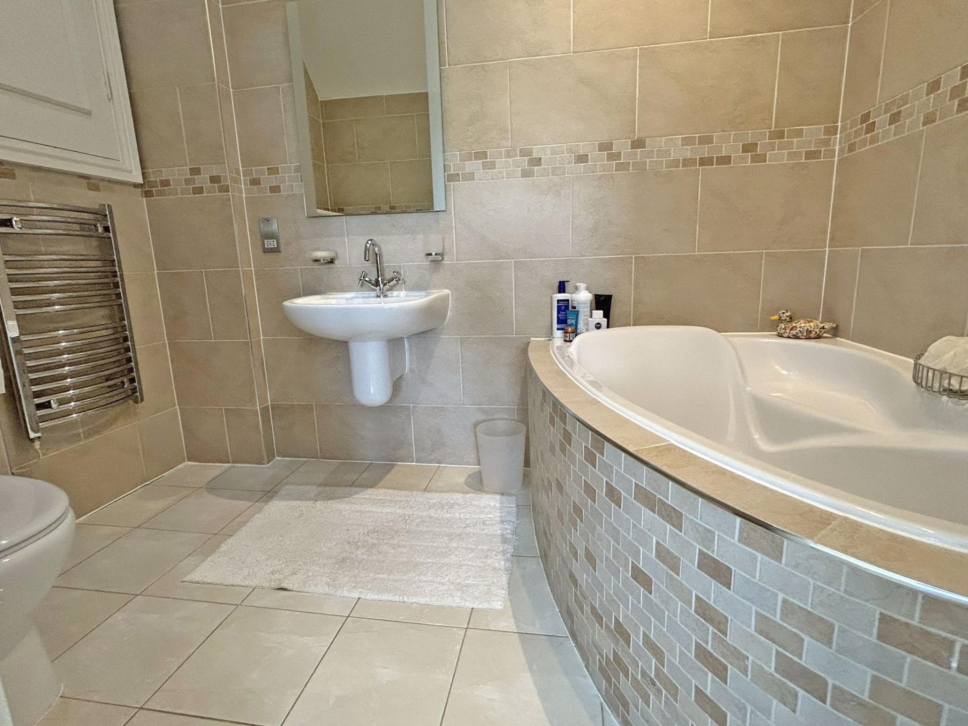 to EN SUITE BATHROOM with fully tiled walls and floor. Panelled corner bath. WC with concealed cistern. Wall hung wash basin. Chrome heated towel rail. Shaver point and mirror. Downlights. Extractor.