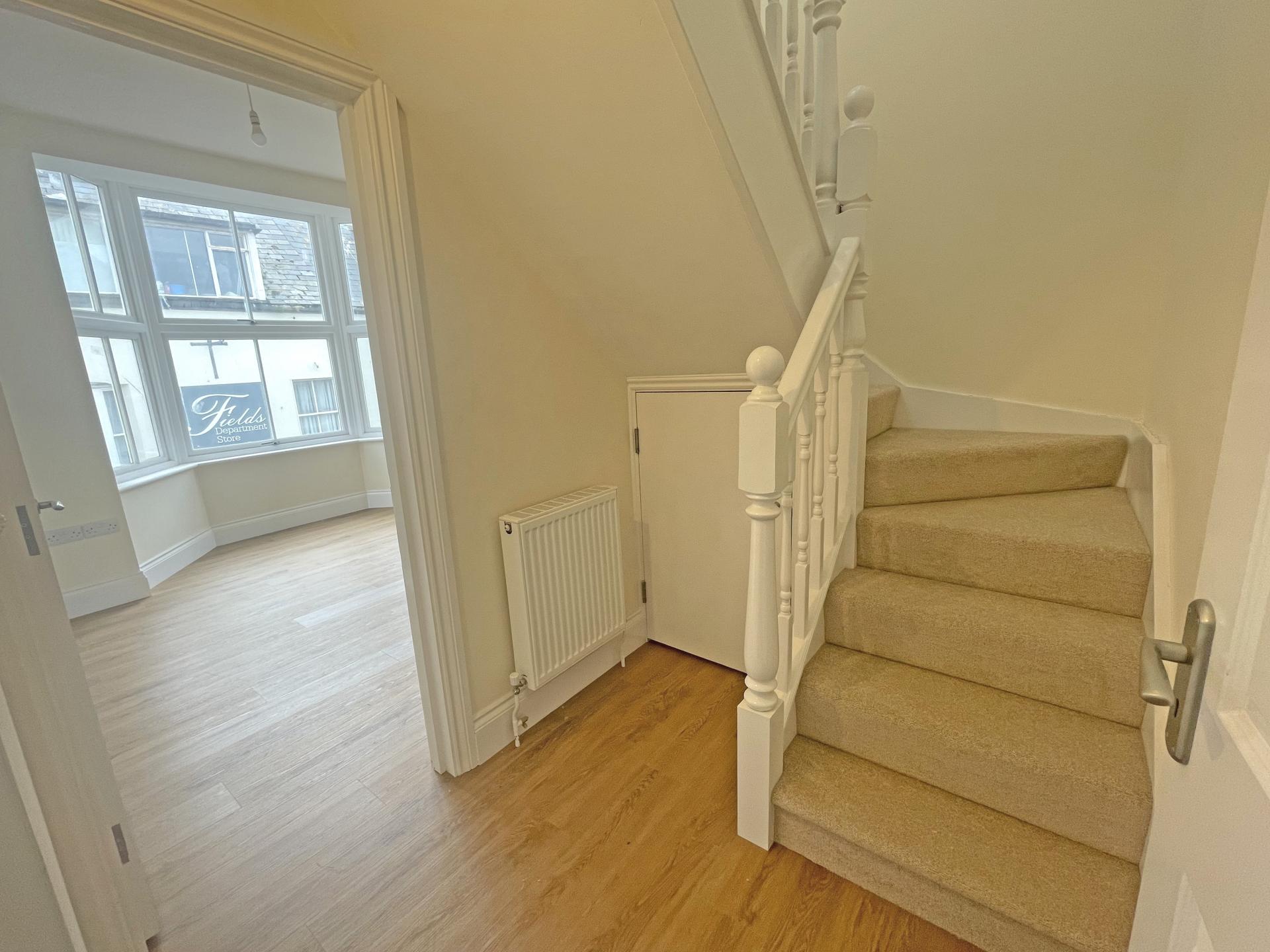 Entrance door from church street (door entry control), communal stairs and landing, door to flat. Entrance lobby and staircase. Open plan sitting / dining and kitchen with large bay window. Kitchen with elec oven, hob and cooker hood. Space for washing machine and fridge / freezer. 2nd floor landing, two bedrooms, bathroom. Double glazed windows. Gas central heating. Window dressings. Carpets and solid flooring. Presented UNFURNISHED. EPC: C. Available 29th April 2022. Minimum length of tenancy: 12 months (prefer longer term). No children, pets or smokers. Rent: 825.00. holding deposit 190.38. Total Deposit 950.00