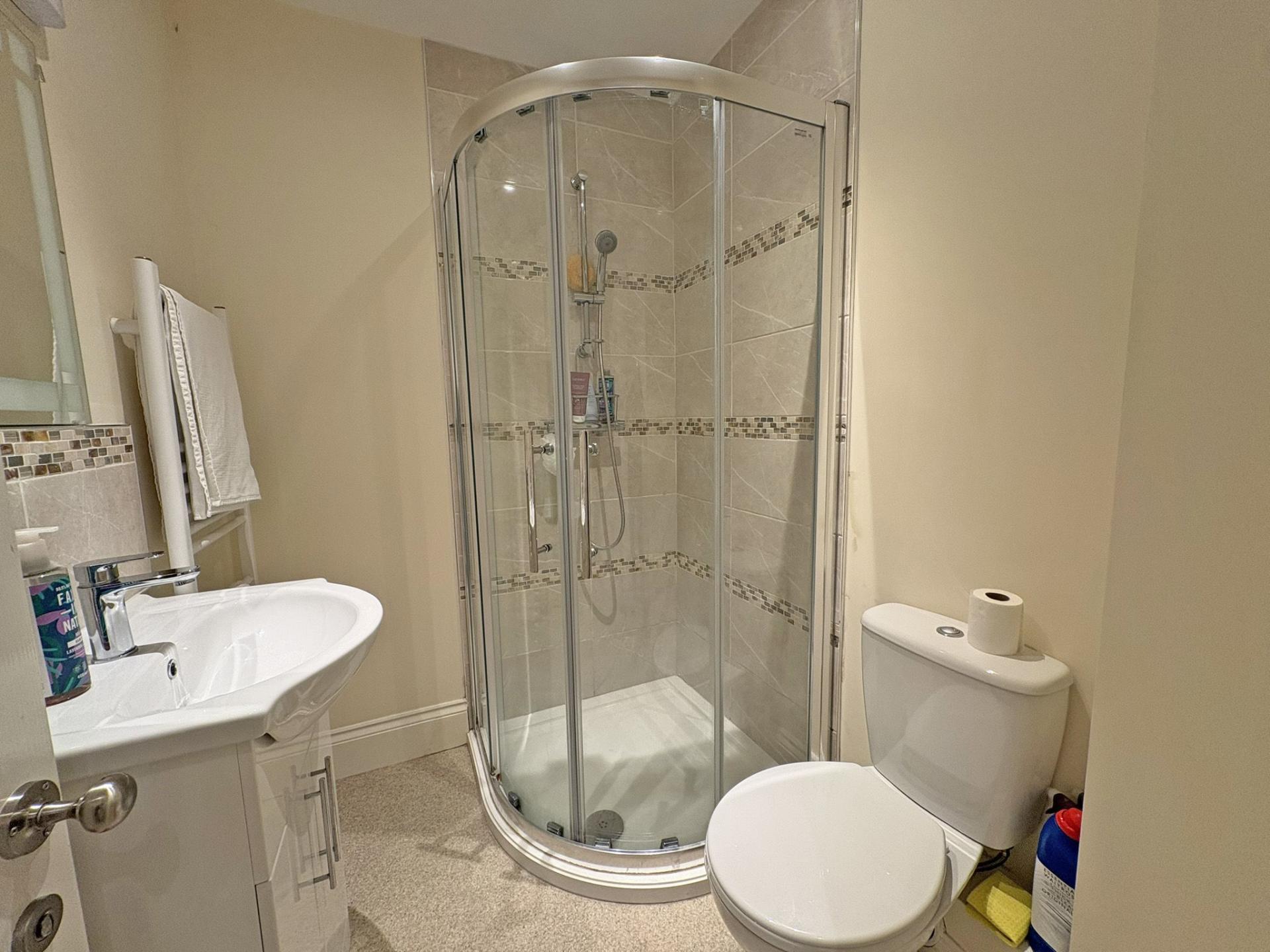 White suite comprising WC, wash basin and vanity cupboard with light and shaver point over. Quadrant shower cubicle with fully tiled walls. Exposed shower mixer valve with shower rose and riser rail. Heated towel rail. Ceiling downlights. Extractor. Lino floor covering.