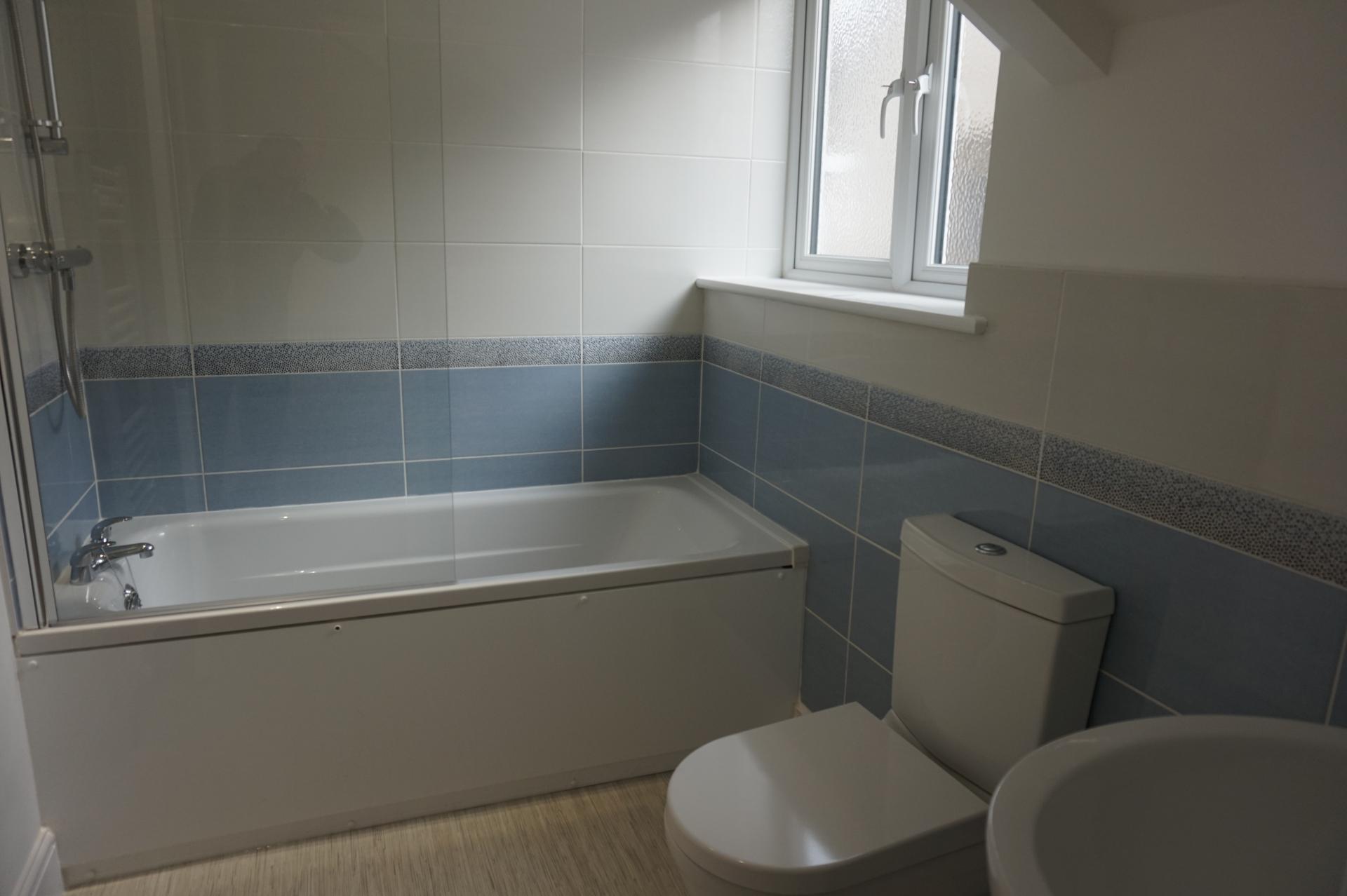 Obscure uPVC double glazed window to the side aspect. An attractive white suite comprising a panelled bath with a glazed shower screen and fully tiled walls over, exposed shower mixer valve, shower rose and wall mount, low level WC and pedestal wash basin. Fitted ‘ladder style’ towel rail. Attractive choice of high gloss white and blue wall tiles with co-ordinating border tile. Low voltage LED lights. Ceiling extractor. Vinyl flooring.
