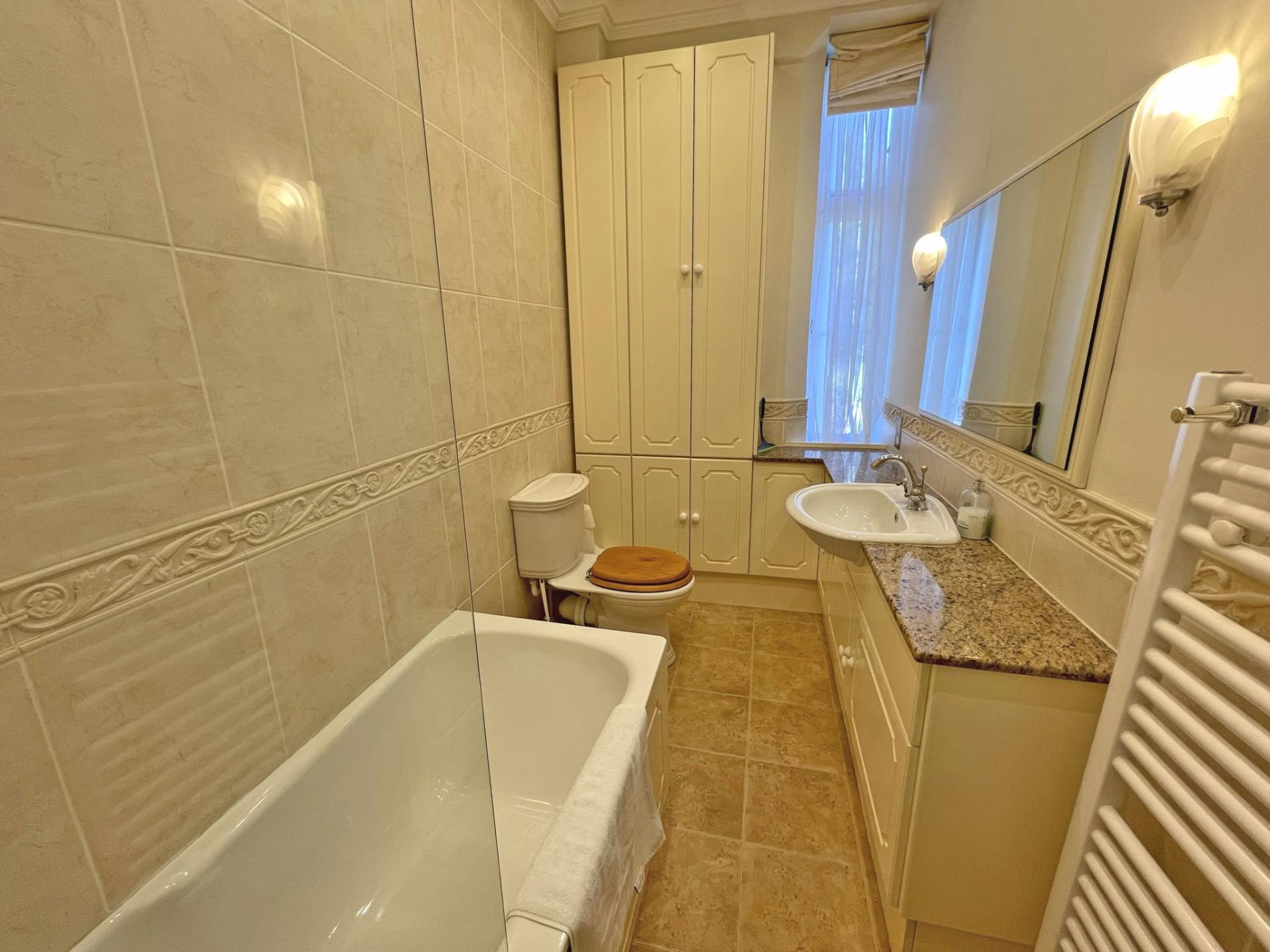 This first floor apartment is tastefully presented with modern kitchen and bathroom, neutral decor and gas fired boiler with under floor heating. The property is furnished and available as a winter let for six months.