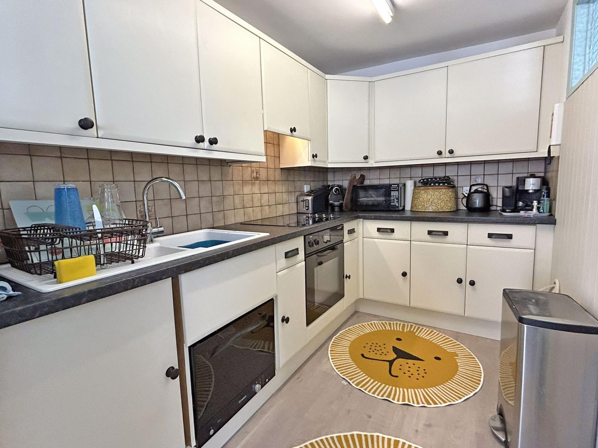 3.08m (10’01) x 1.91m (6’03) Fitted kitchen comprising a range of floor standing and wall mounted cupboards with co-ordinating worksurfaces and tiled splashbacks. Built in single electric oven. Electric hob and cooker hood over. One and a half bowl sink incorporating drainer. Integrated under counter fridge with freezer compartment. Built-in micro dishwasher. Karndean flooring. Obscure glazed window sharing light from sitting room.