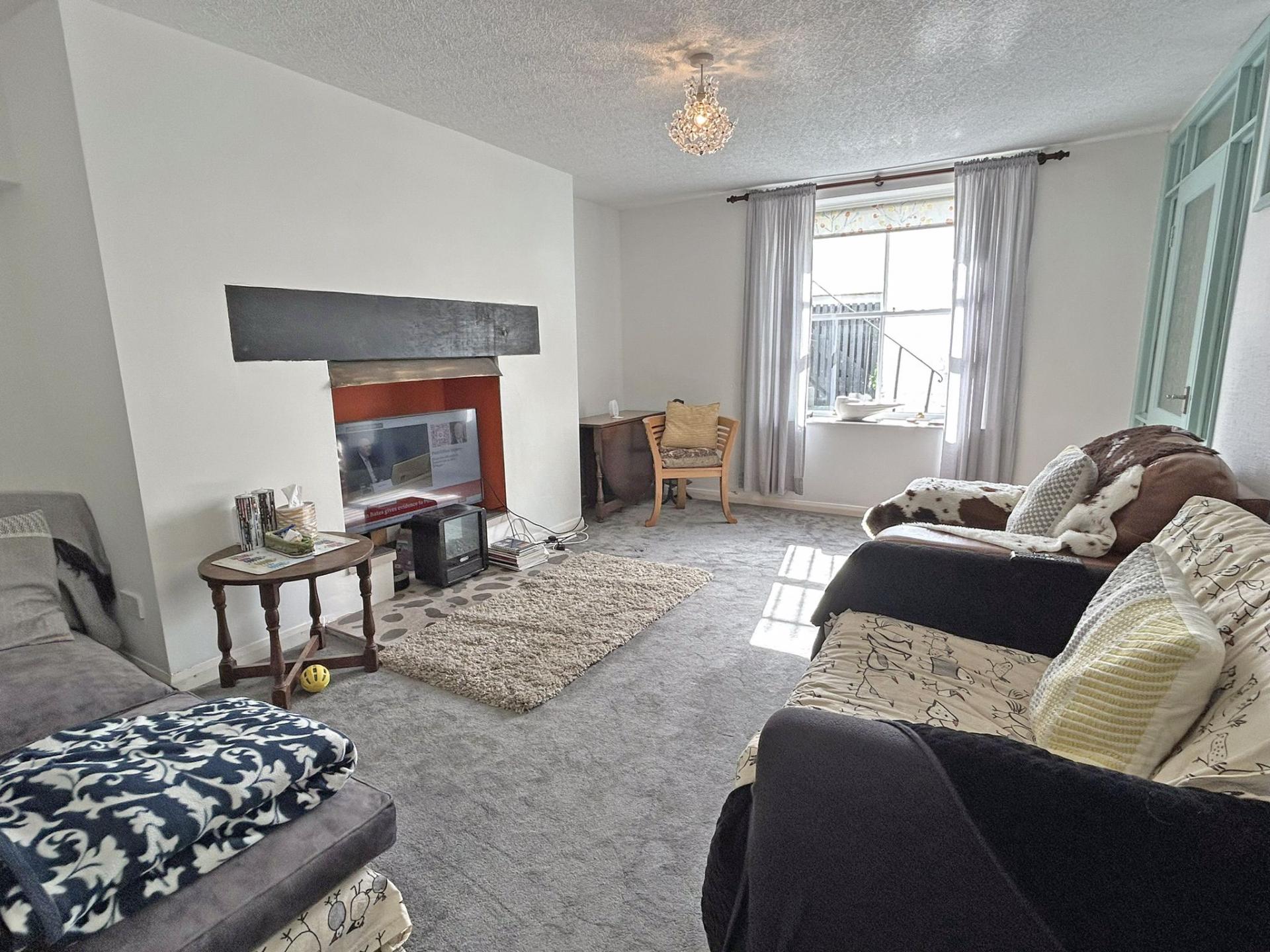 4.81M (15’09) X 3.21M (10’06) Single glazed sash window with southerly aspect. Fireplace and hearth (feature only). TV point. Carpet. Night storage heater. Blinds and curtains.