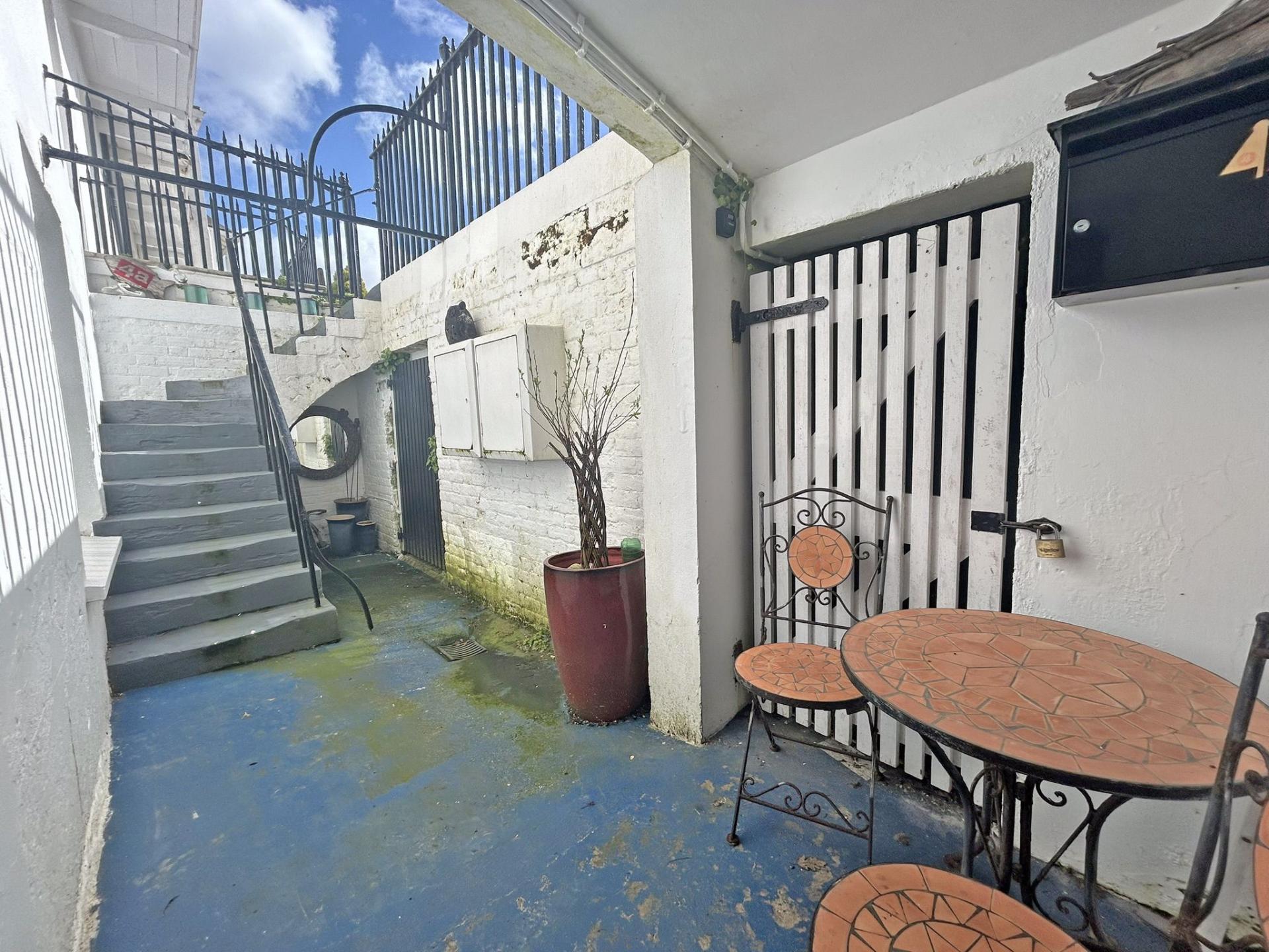 To the front of the property at the lower ground floor level is a small courtyard which has a southerly aspect. Hardstanding with bistro table and chairs. Storage cupboard for a bicycle and access to a communal bin store. (left door)
