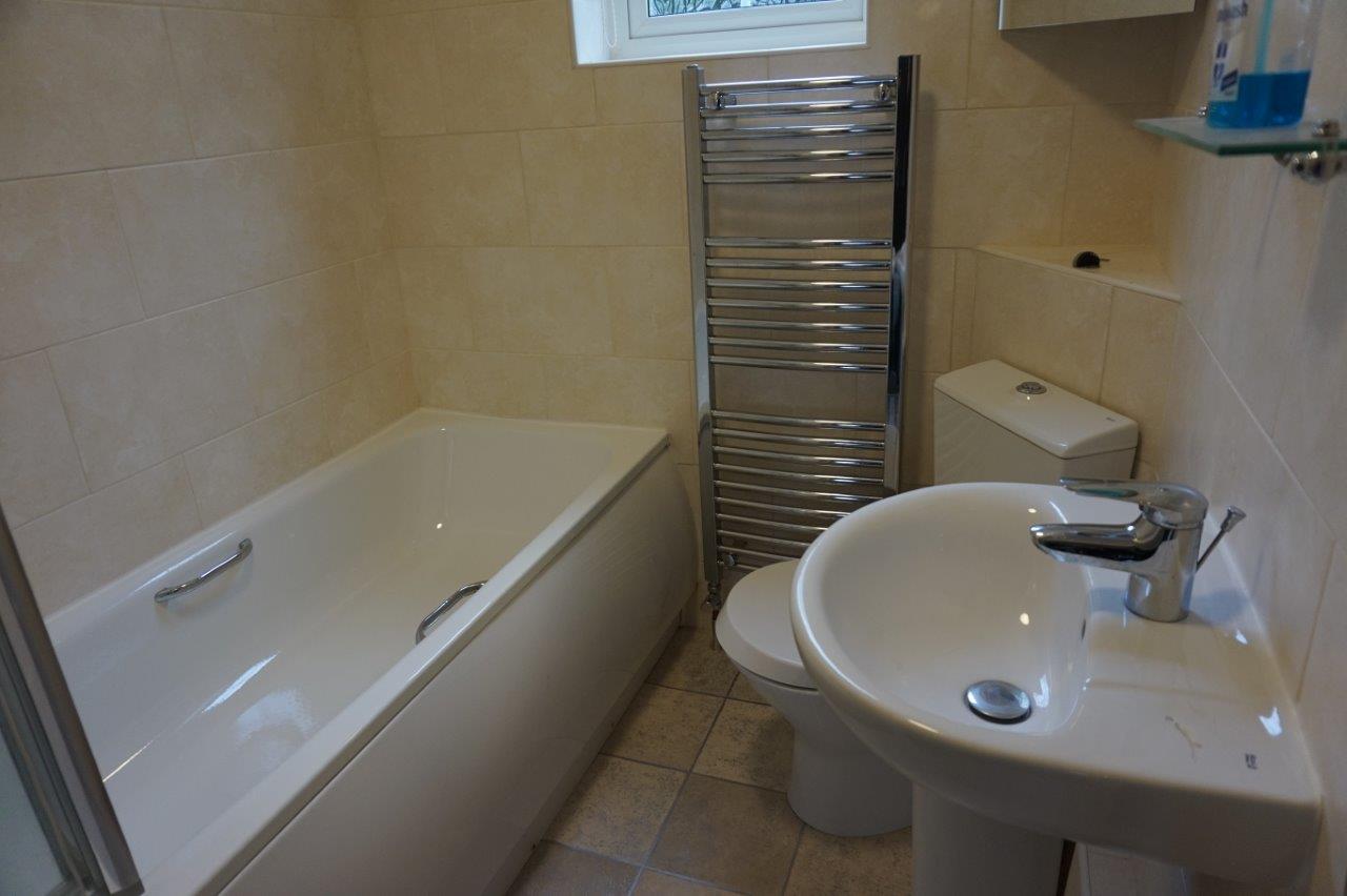 A modern bathroom with a white suite comprising a panelled bath with silver hand grips, fully tiled walls, folding glass shower screen, Roca shower with hand held attachment and sliding rail, low level WC and pedestal wash basin with mirror over and fitted glass shelf. Corner mirror fronted bathroom cabinet. Chrome ladder style heated towel rail. Lino floor covering. Access to the loft space via a hatch. uPVC obscure glazed window with a fitted roller blind.