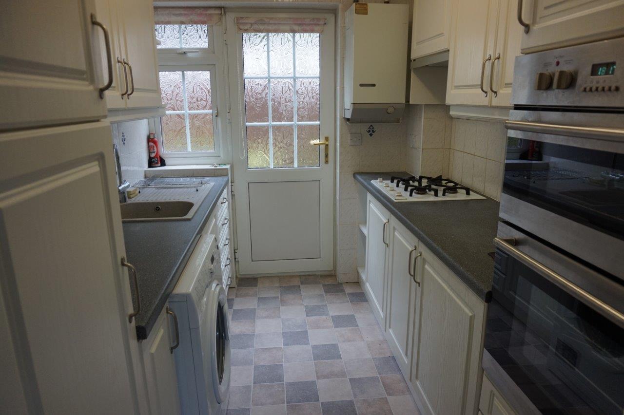 2.64m x 2.09m (8’08” x 6’10”) A fully fitted kitchen comprising a range of floor standing and wall mounted cupboards with white ‘Shaker Style’ door and drawer fronts, grey work surfaces and tiled splashbacks. There is a sink unit finished in grey with a single drainer and chrome mixer tap. Built-in stainless steel electric double oven with glass fronted doors, which incorporates a grill and top oven with fan assisted main oven and four burner gas hob with extractor over. Integrated under counter fridge and integrated under counter freezer. Freestanding Hotpoint washing machine. Lino floor covering. Mains heat detector. Wall hung Potterton gas fired boiler with Potterton time clock and controls. There is also a hatch from the kitchen at worksurface level with doors that open into the dining room. uPVC obscure double-glazed door with adjoining obscure glazed window, providing access to the rear of the terrace and rear courtyard area.