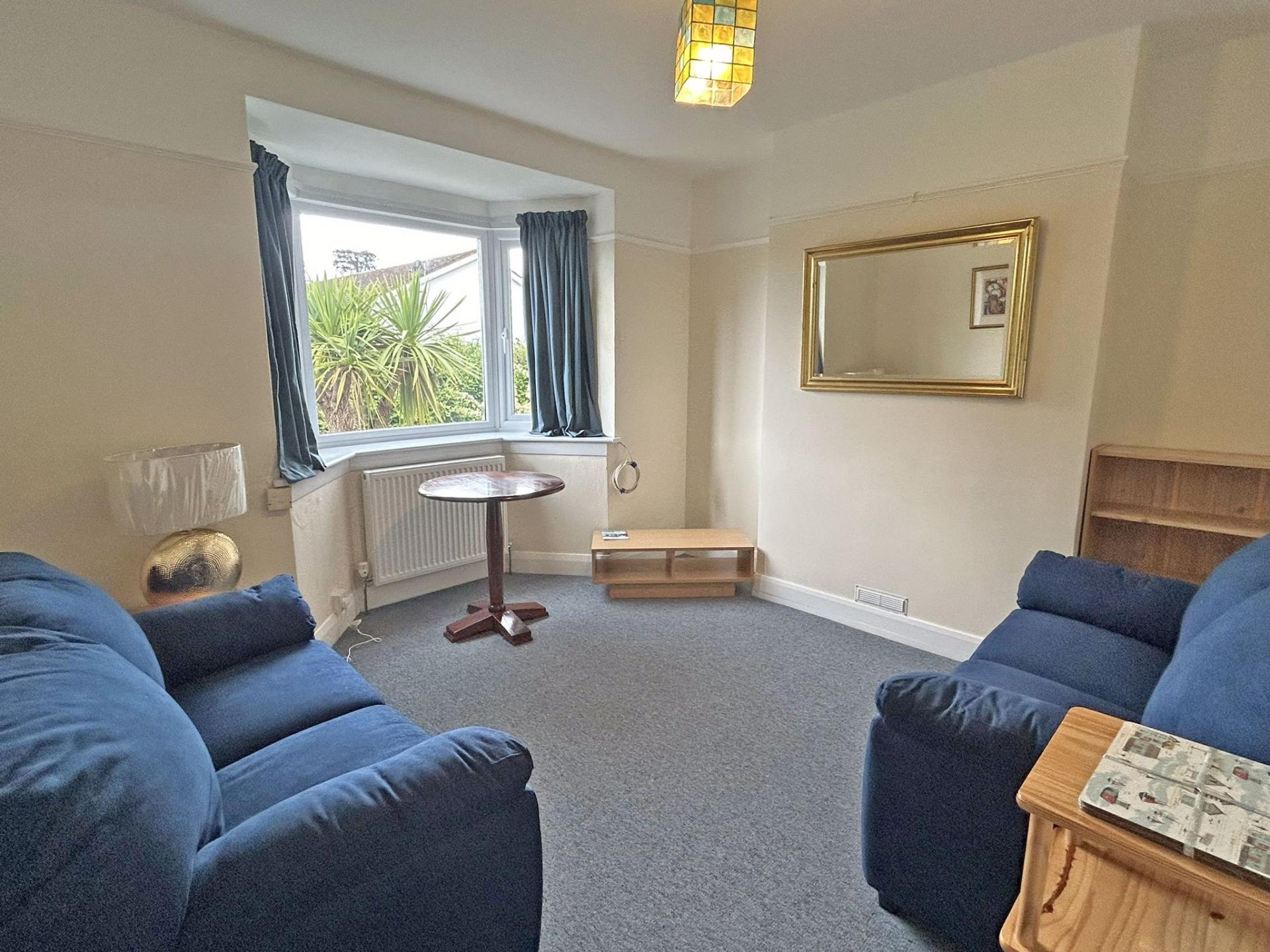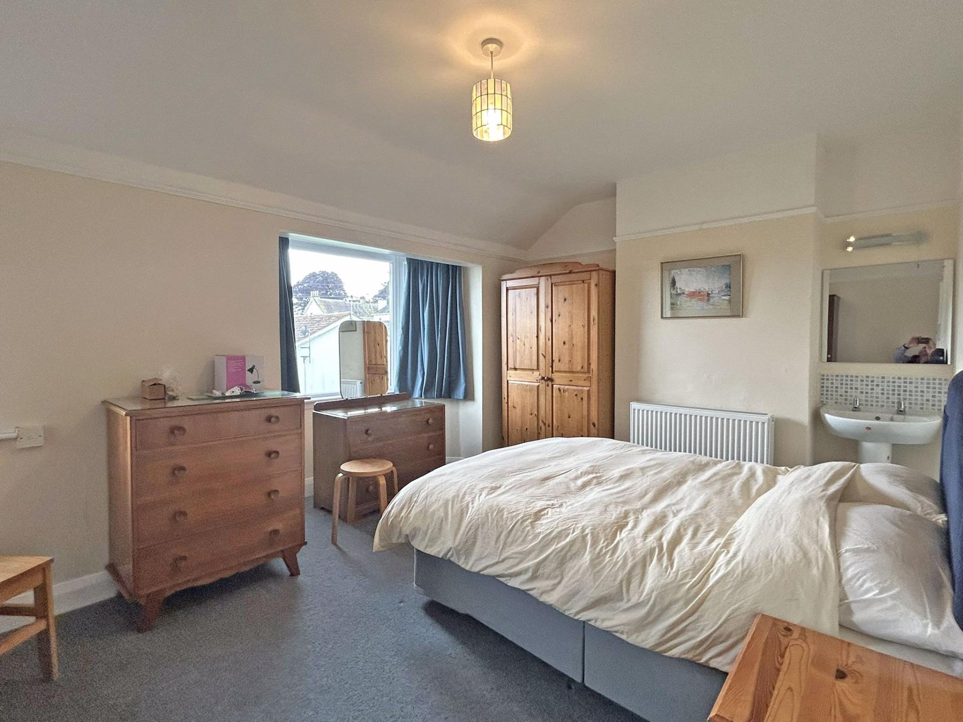 4.43m (14’06) max into chimney alcove x 3.4m (9’11) plus bay. uPVC double glazed windows to the front aspect. Views to Salcombe Hill and in a Southerly direction. Curtains. Radiator. Wash basin with light and mirror over. Carpet.