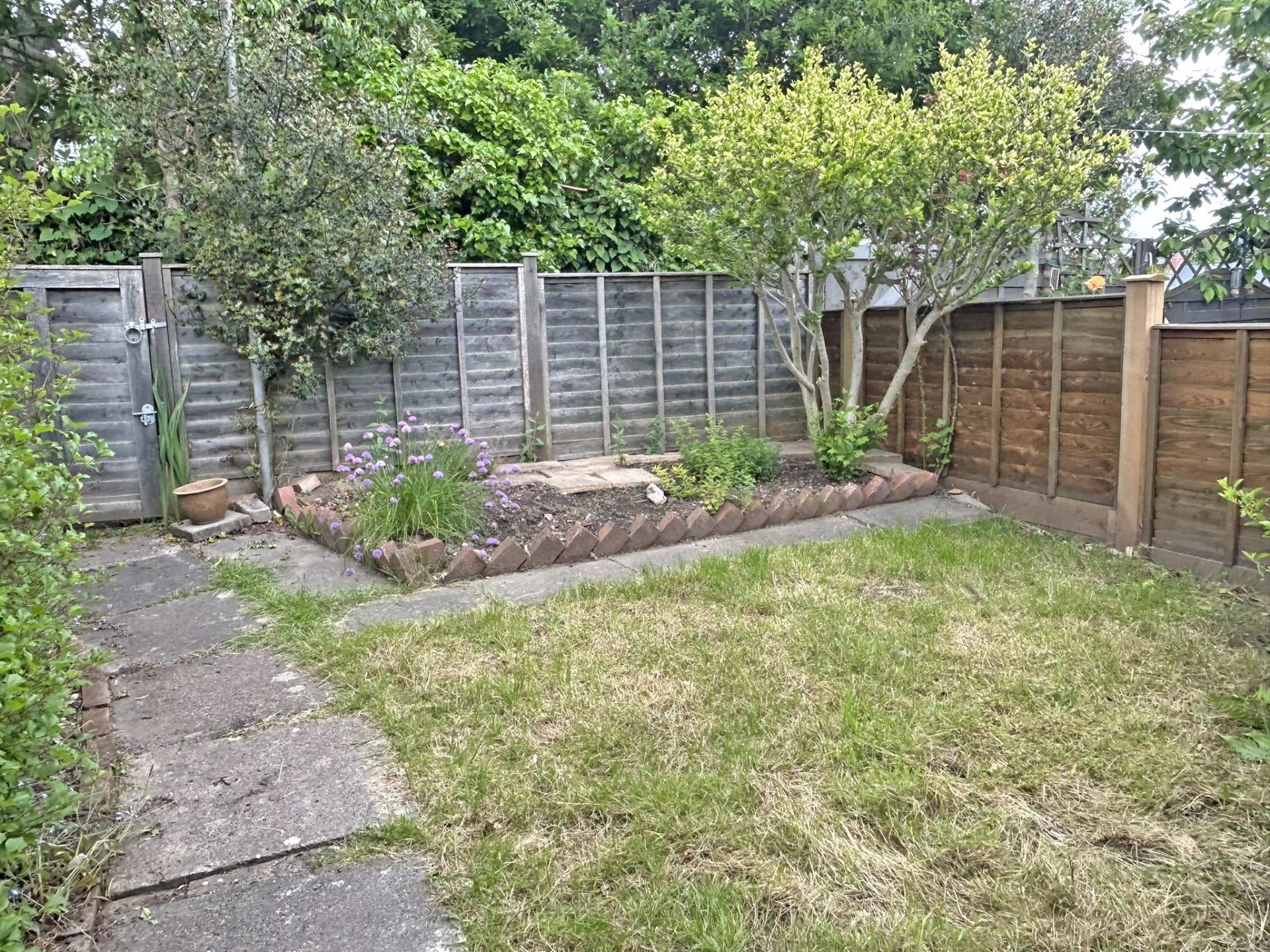 Fully enclosed rear garden with mature shrubs and small lawn. Garden shed. Washing line. Outside light. Tap. Electric socket. Paved area and rear access pedestrian gate.