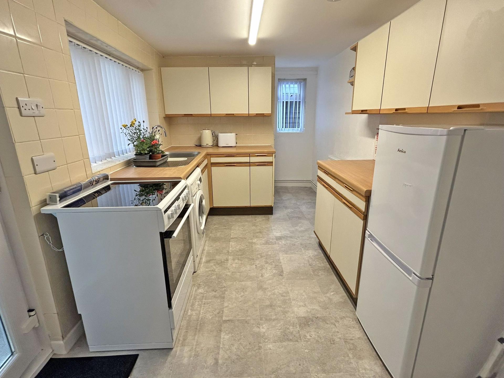 3.63m (11’11) x 2.35m (7’08) uPVC double glazed window and door to rear. Fitted kitchen floor and wall side cupboards. One and a half bowl sink with drainer and tiled splash back. Freestanding Electric Cooker. Freestanding Fridge Freezer. Freestanding Washing Machine. Tile effect lino floor covering. Blind. Radiator. Door to storage cupboard. Door to: