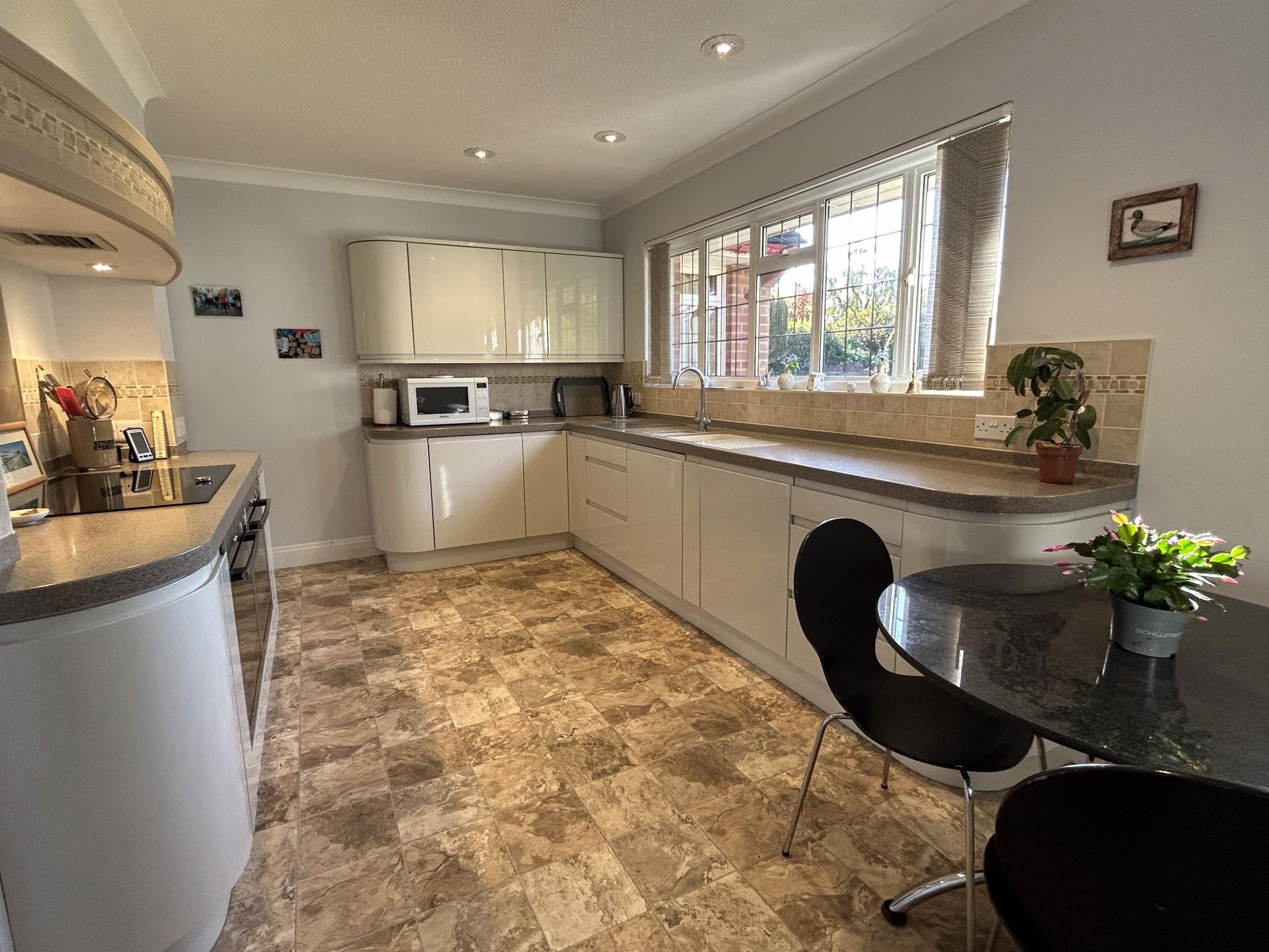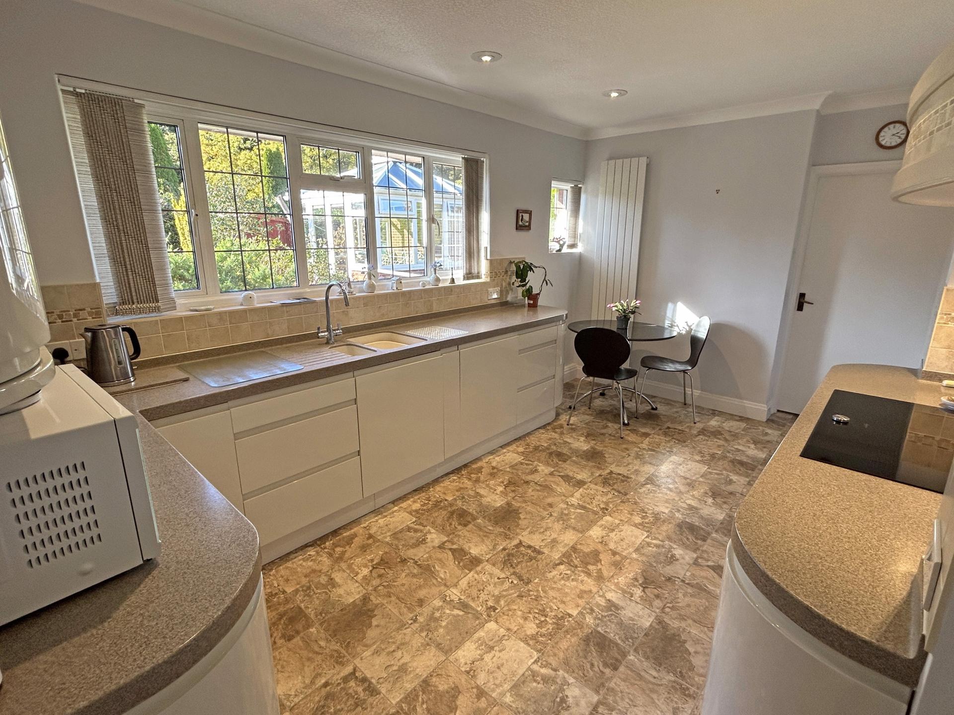 4.85m (15’10) max x 3.03m (9’11) Double glazed windows to rear garden. Modern fitted kitchen comprising a range of floor standing and wall mounted cupboards with cream high gloss door and drawer fronts. Corian worksurfaces with upstands and tiled splashbacks. One and a half bowl sink incorporating drainer in Corian. Two built in under single electric ovens, induction hob, glass and tiled splash back. Extractor and lighting over. Integrated dishwasher and integrated undercounter fridge-freezer. free standing fridge and freezer. LED ceiling down lights. Tile effect lino floor covering.