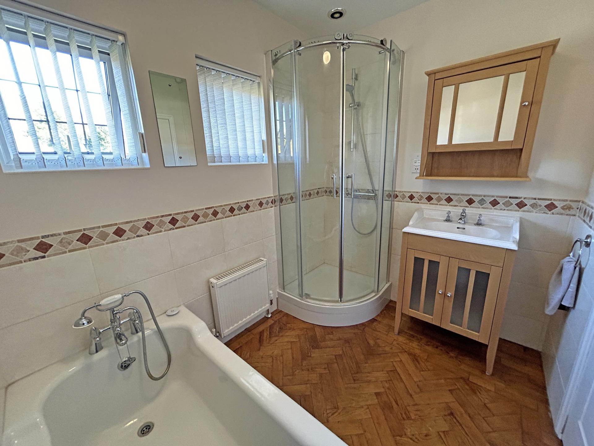 Pair of double glazed windows to the front aspect. A modern white suite comprising shower cubicle with glazed sliding doors. Fully tiled walls internally. Exposed shower mixer valve with shower rose and riser rail. Wash basin and vanity cupboard. Mirror fronted cabinet over. Low sided bath with bath shower mixer tap and rose. Radiator. Paquet flooring. Heated towel rail. Ceiling lights and extractor.