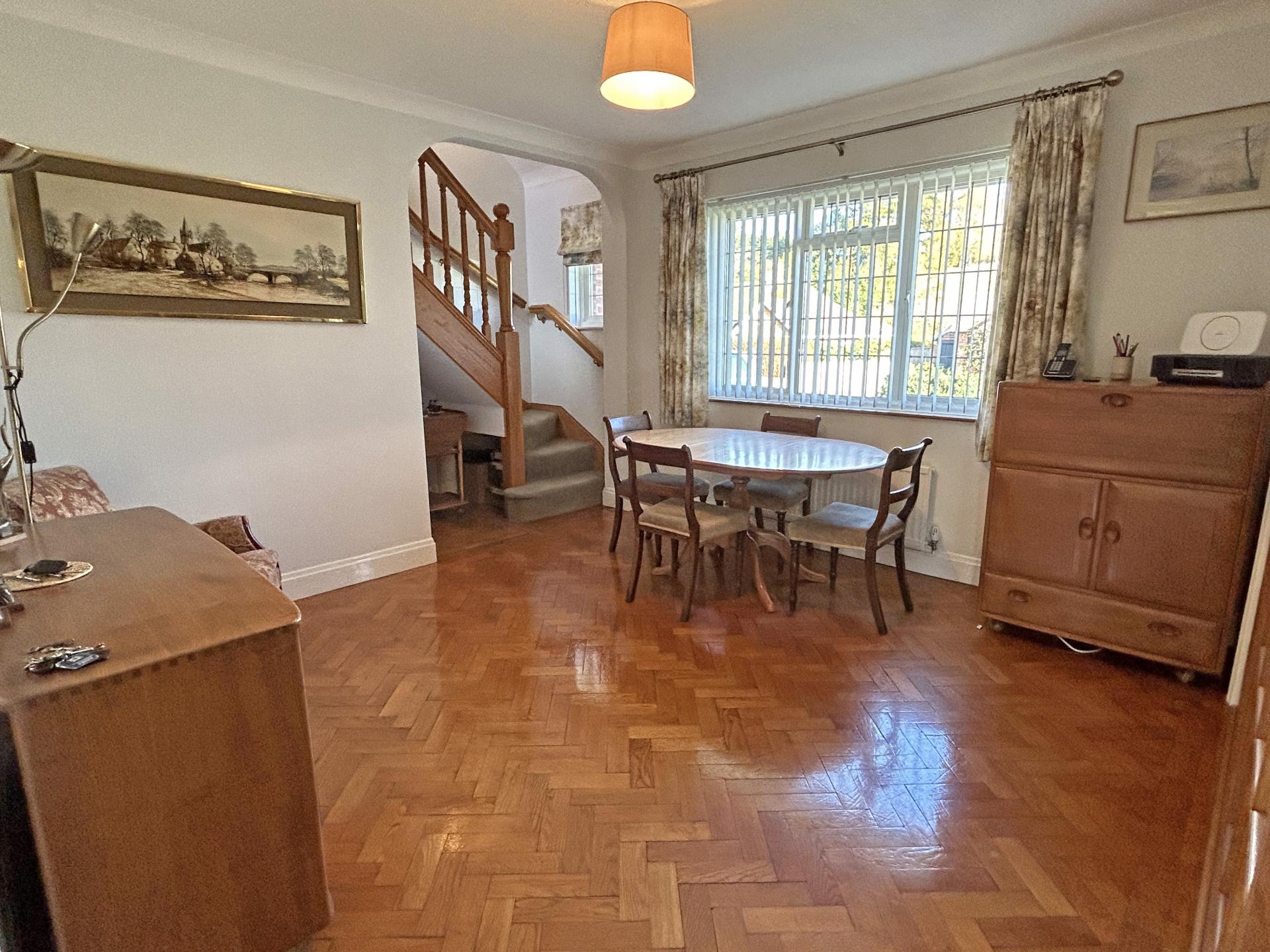 Paquet flooring. RECEPTION/DINING HALL 3.45m (11’04) x 3.67m (12’) Double glazed window to front aspect. Blinds and curtains. Radiator. Central heating room stat. Paquet flooring. Staircase.