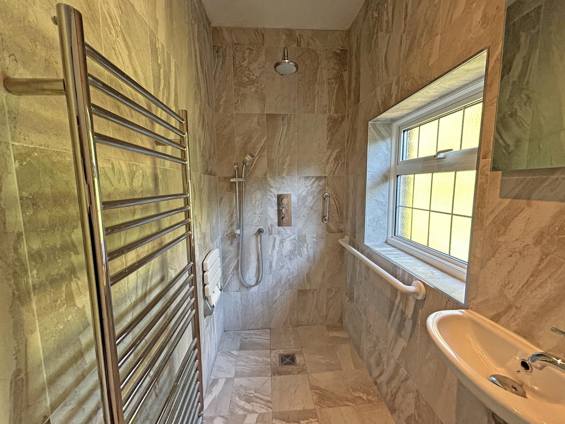Fully tiled floors and walls. Shower rain head. Exposed shower mixer valve with shower rose and riser rail. Wall hung wash basin. Chrome heated towel rail. Obscure double glazed window to side aspect. Ceiling down lights and extractor