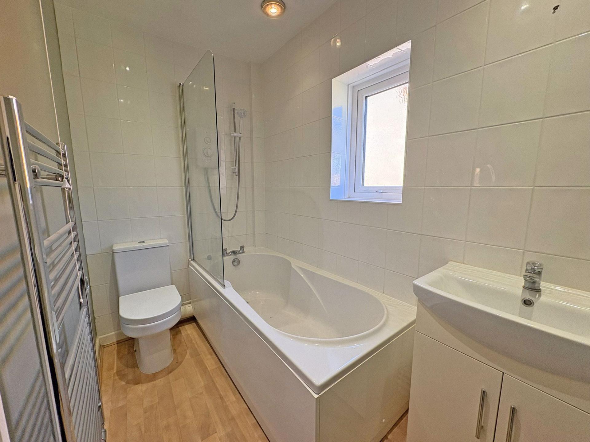 Obscured uPVC window. Extractor. Modern white suite comprising WC, pedestal wash basin and panelled bath with fully tiled walls over. Shower and glass screen. Heated towel rail. Lino flooring.