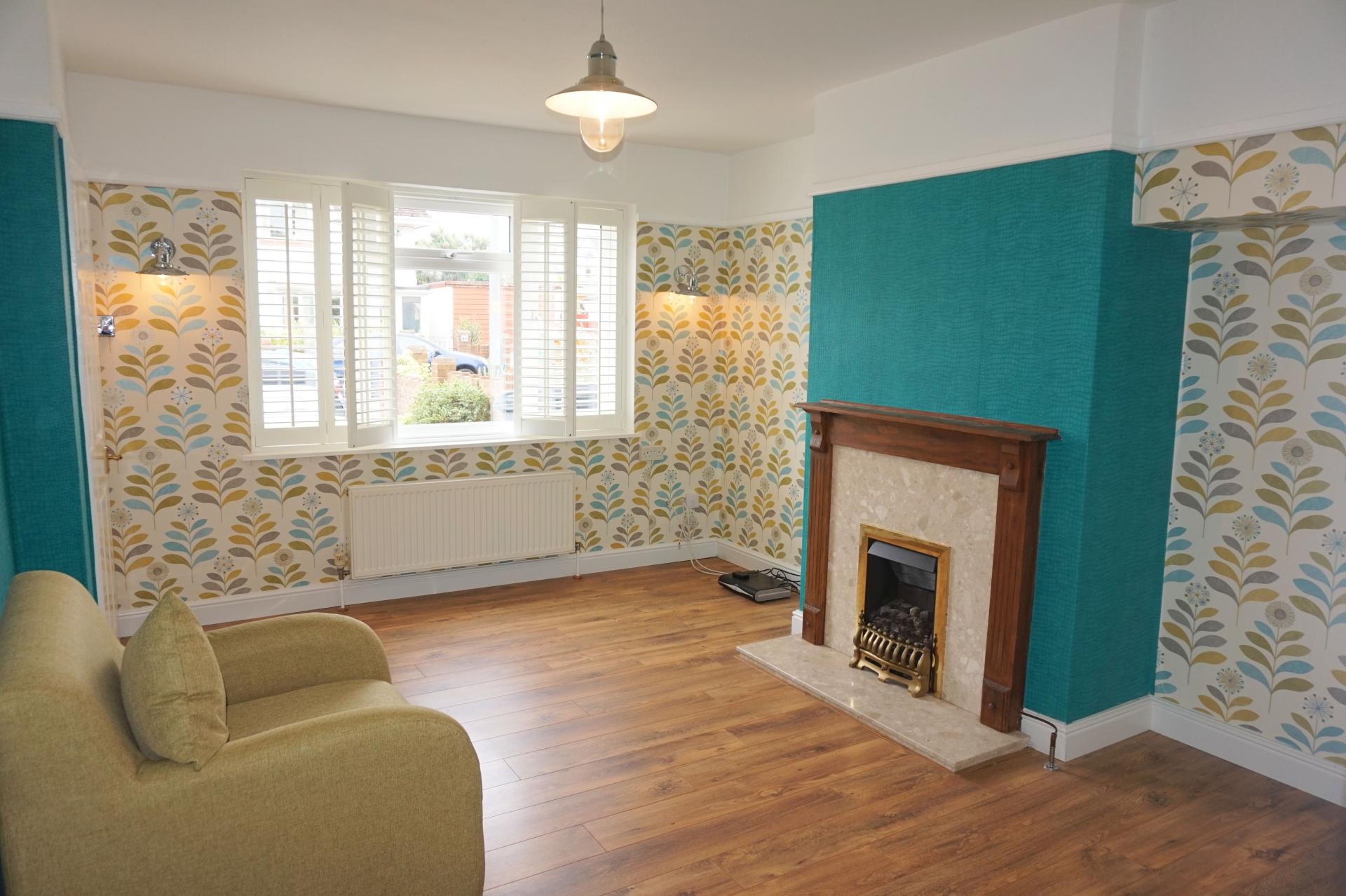 4.35m x 3.25m (14’ x 10’05) Maximum into chimney recess. uPVC double glazed windows to the front aspect, featuring internal fitted wooden louvred shutters. Dark wood effect timber, laminate flooring. Radiator. Feature fireplace with timber surround, marble hearth and living flame gas fire. BT point. Sky TV cable. Wall lights. Central ceiling light. Bi-fold door to: