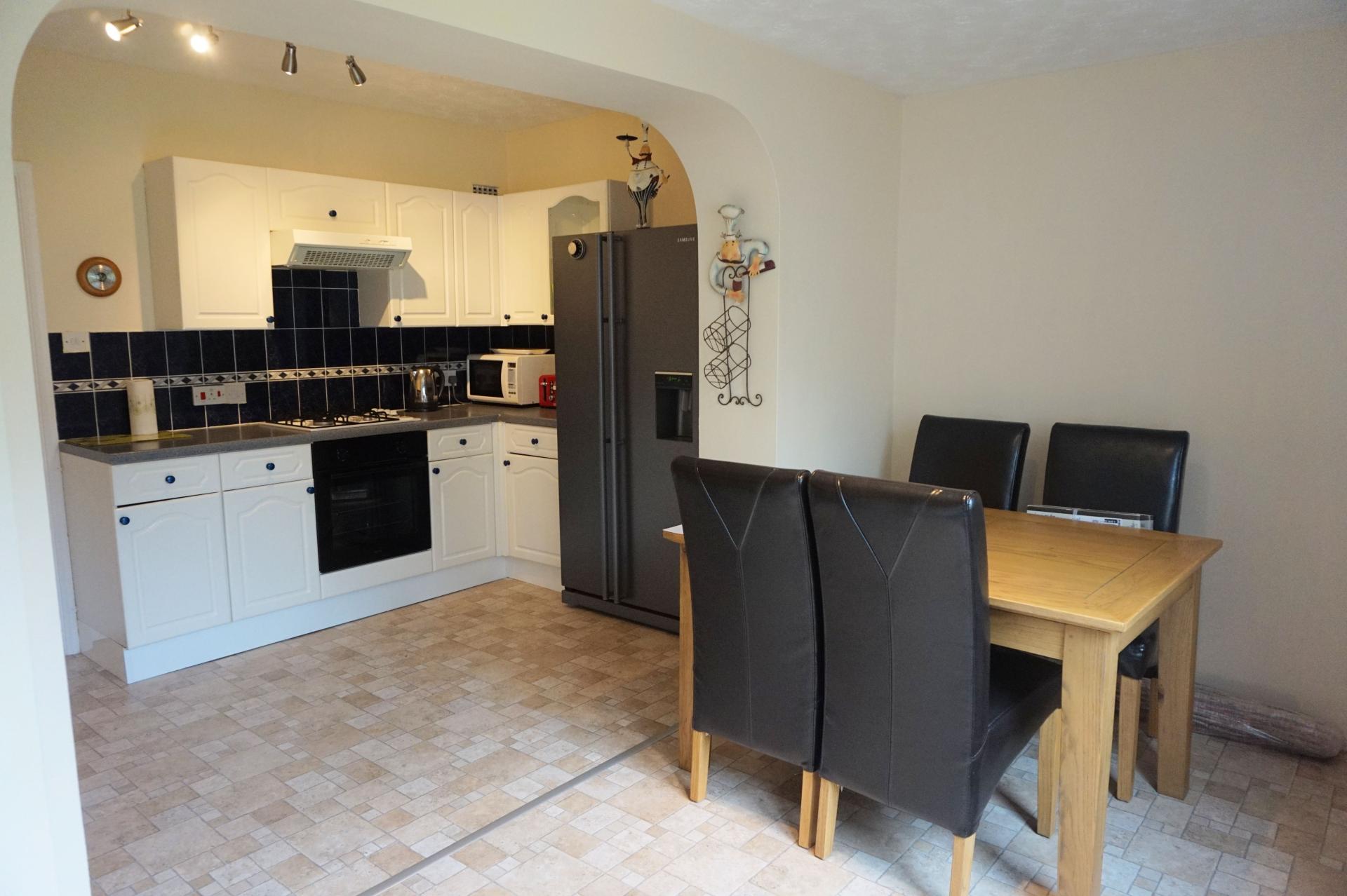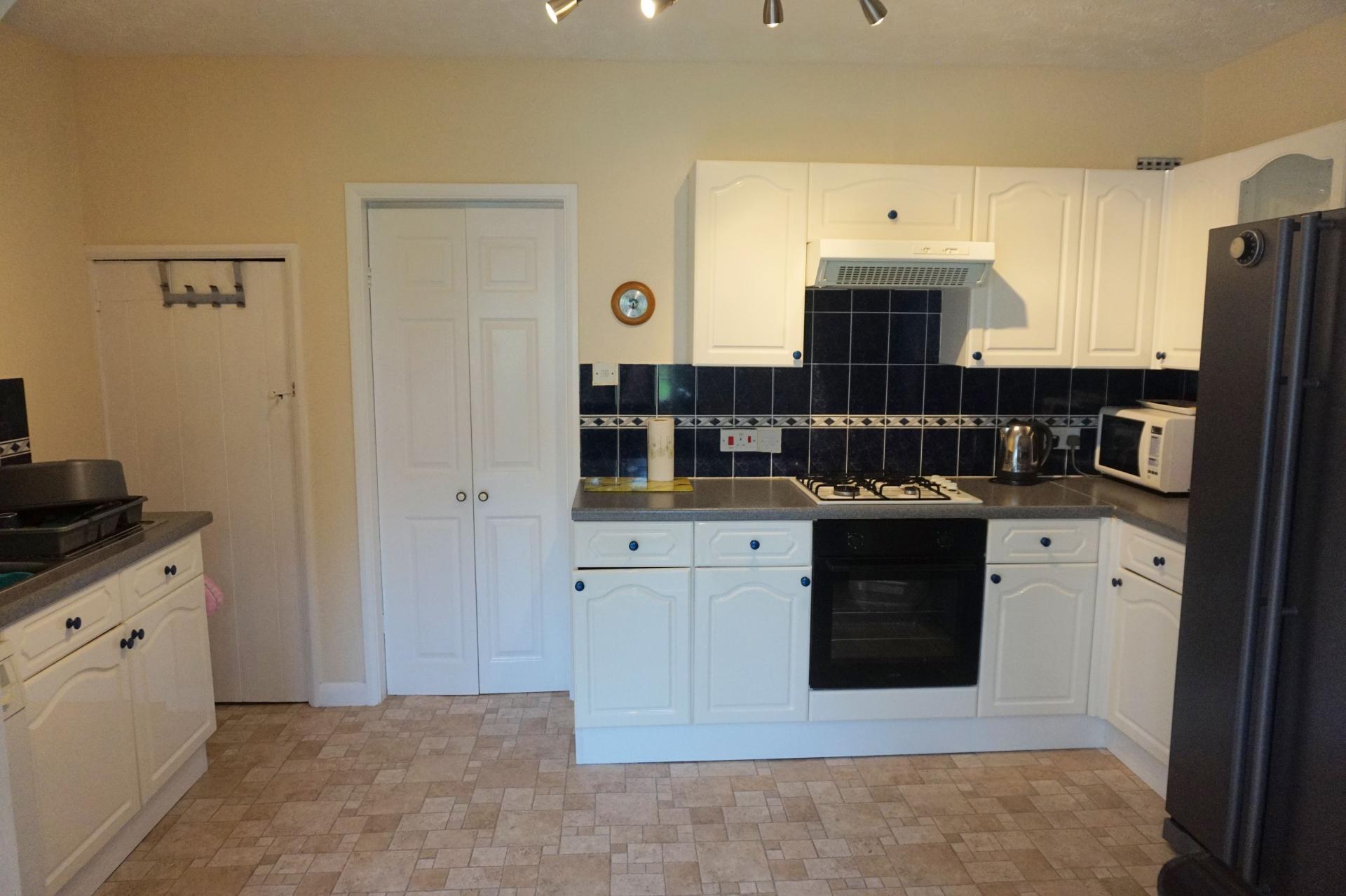 (Archway connecting both rooms) Overall max measurements 4.25m x 4.45m (14’ x 14’05) uPVC double glazed back door providing access to the back garden, and an adjoining uPVC window, with a pleasant outlook to the rear. Fitted kitchen comprising a range of floor standing and wall mounted cupboards with white high gloss drawer and door fronts, grey co-ordinating work surfaces and tiled splash-backs. Single bowl stainless steel sink with drainer and mixer tap. Built-in under counter single electric fan oven and grill. Four burner gas hob over and extractor hood with light and fan. Freestanding Samsung American fridge/freezer with a 60/40 split. Space for washing machine. Tiled effect lino floor covering throughtout. Ceiling lights. High level fuseboard with RCD protection. Radiator. Roller-blinds to the back door and rear window. Door to: