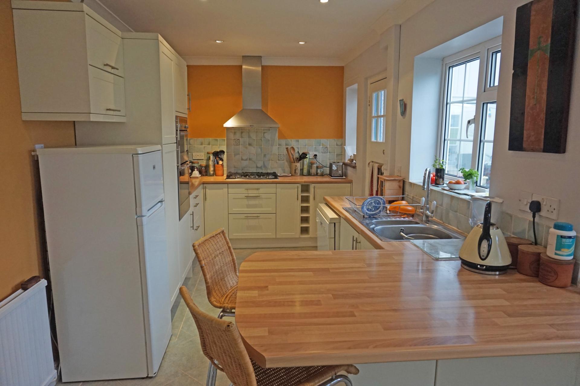 A modern fitted kitchen comprising a range of floor standing and wall mounted cupboards with cream drawer and door fronts, stainless steel handles and butchers block effect work surfaces incorporating breakfast bar. One and a half bowl stainless steel sink incorporating drainer, with mixer tap. Tiled splash backs. Stainless steel gas hob with stainless steel extractor over. Built in electric double oven incorporating grill. Free standing dish washer and fridge/freezer. Karndean Flooring.
