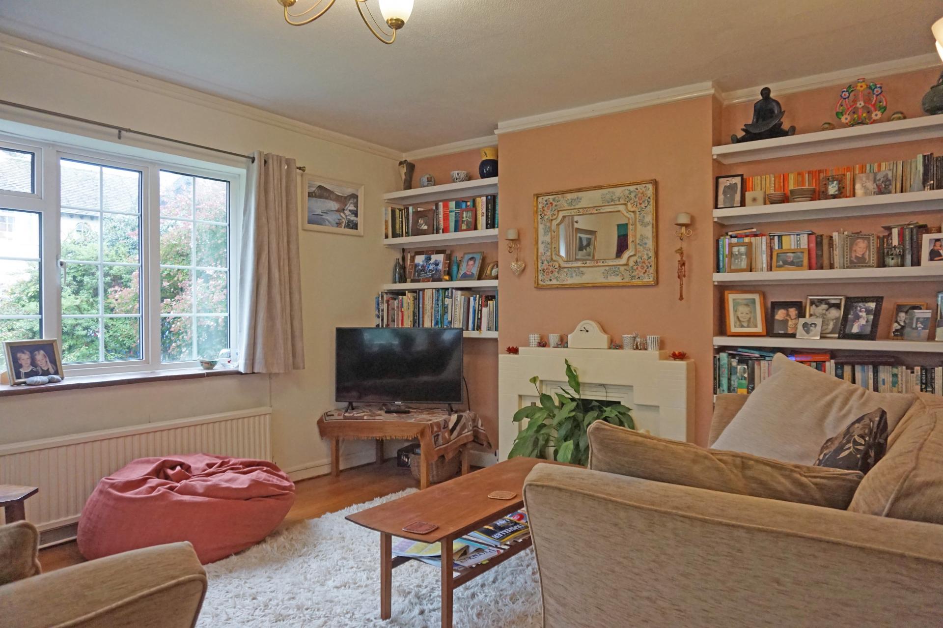 Dual aspect 4.28m (14’) x 3.73m (12’73) Tiled fire surround and Hearth. Open fireplace (not for use). Shelving to chimney alcoves. Stripped wood flooring. Radiators. Two and three seater sofas. TV.