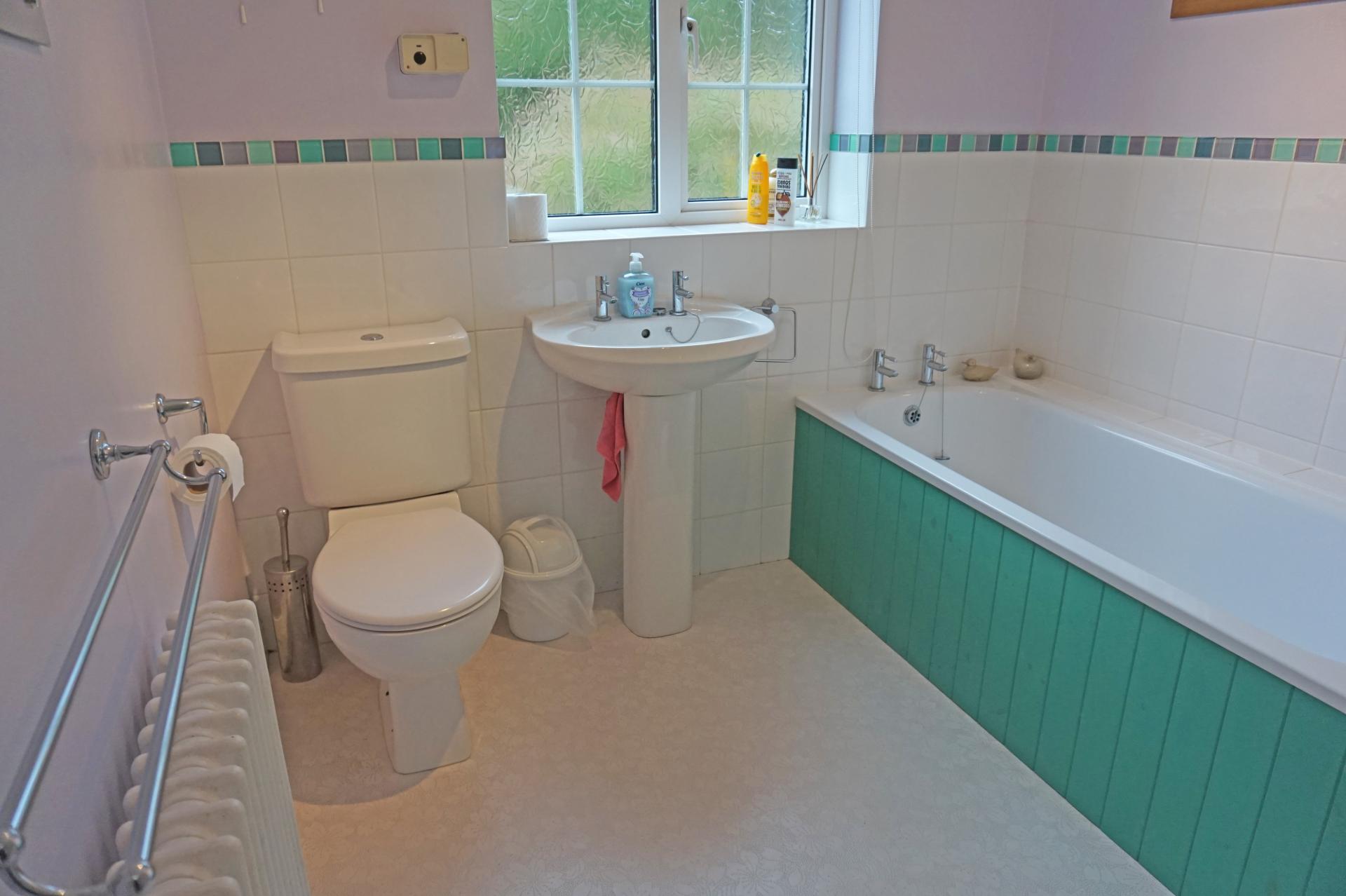 Obscure uPVC double glazed window to rear aspect. White suite comprising pedestal wash basin, panelled bath with part tiled walls. Tiled floor. Heated towel rail. Mira Shower over bath with exposed shower mixer valve, riser rail and shower rose.
