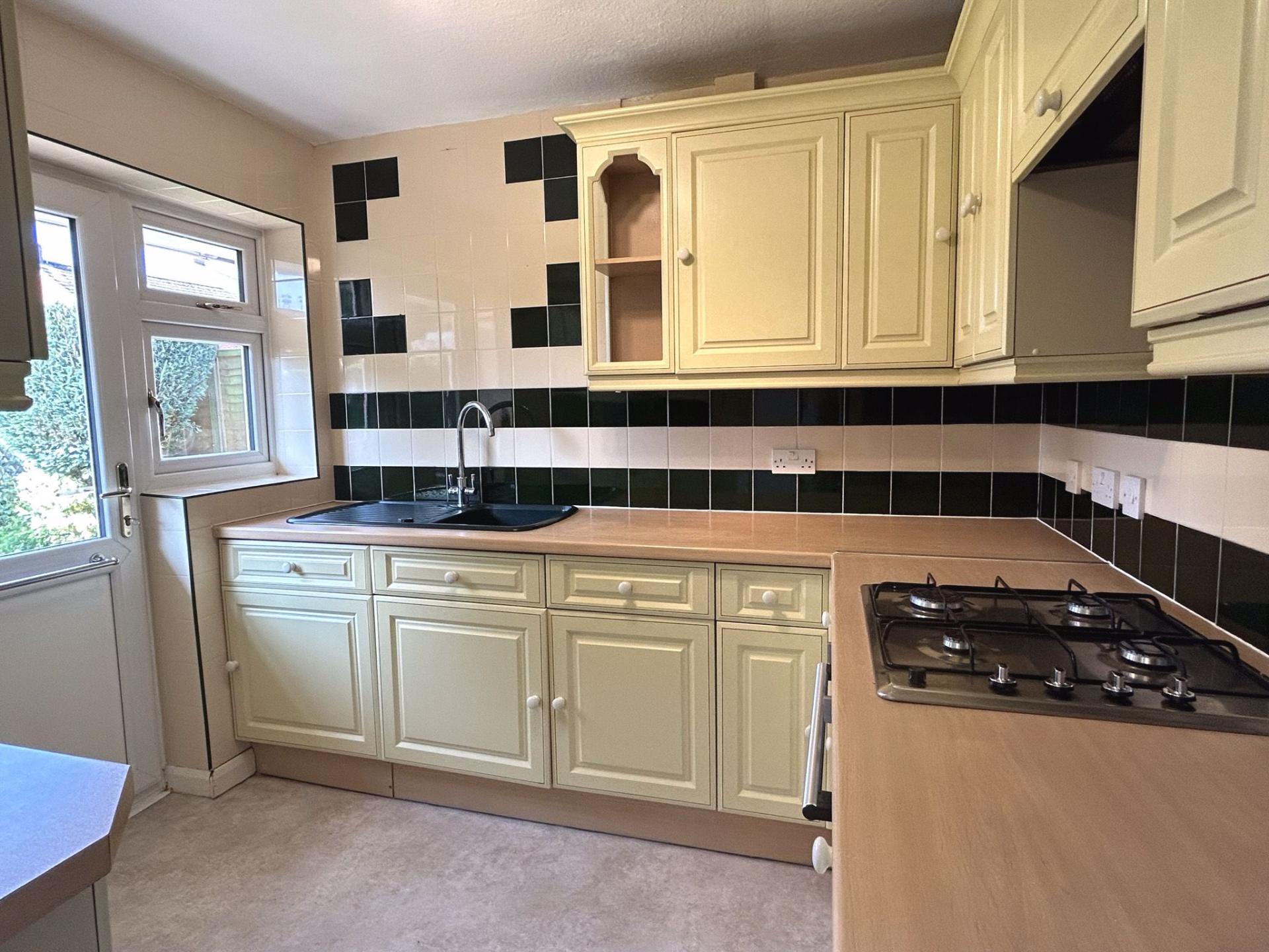 2.63m (8’07) x 2.20m (7’02) uPVC double glazed door to the rear garden and part-glazed window. Fitted kitchen comprising floor standing and wall mounted units with co-ordinating work surfaces. Tile splashbacks. Single bowl sink with drainer. Built-in, under counter, single electric oven. Stainless steel gas hob and cooker hood over. Integrated under counter fridge. Lino floor covering.