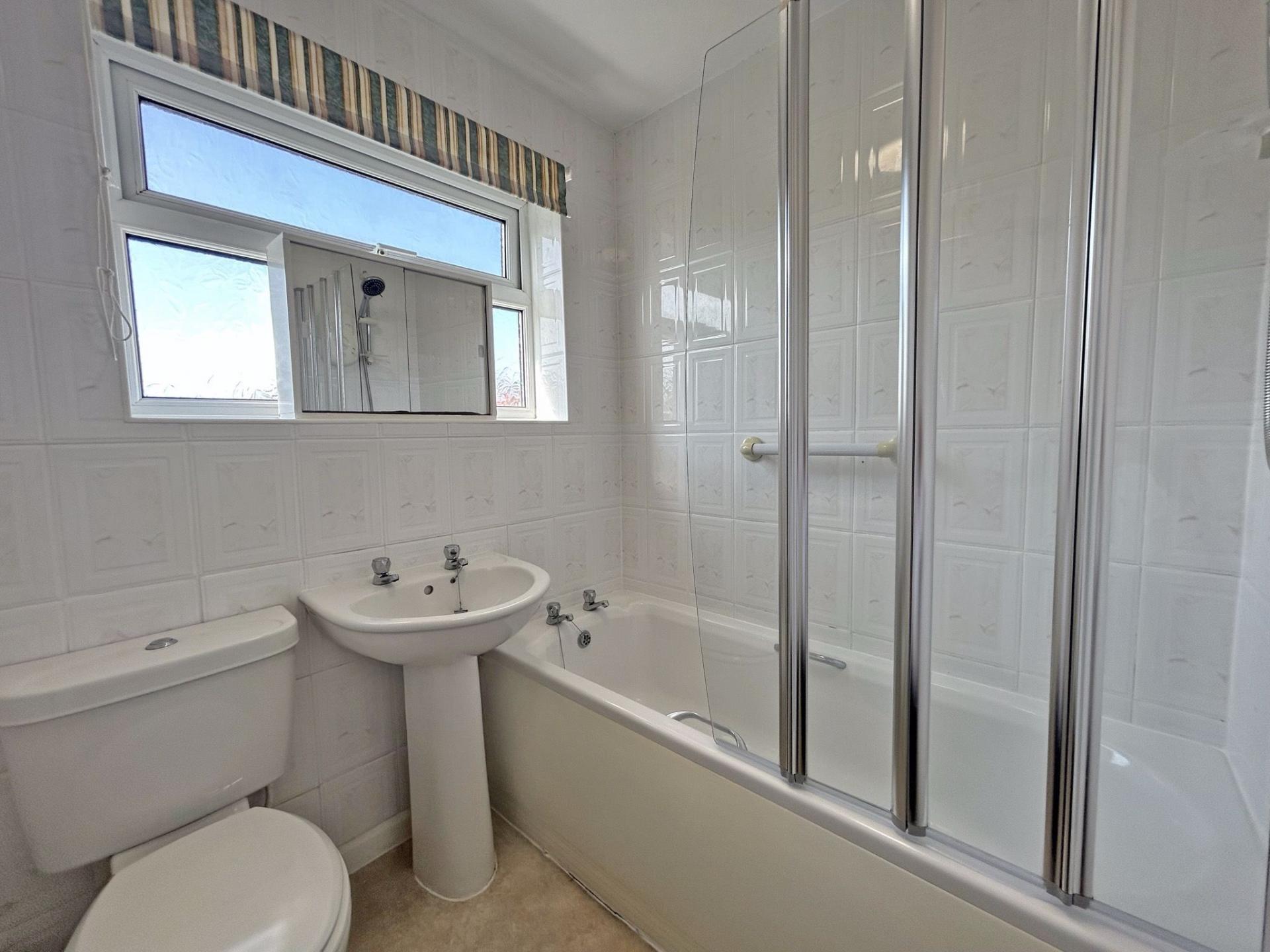 Obscure uPVC window. White suite comprising WC, wash basin and pedestal, panelled bath with patterned, white wall tiles from floor to ceiling. Shower screen. Electric shower with riser rail and rose. LED ceiling light. Lino floor covering. Radiator.