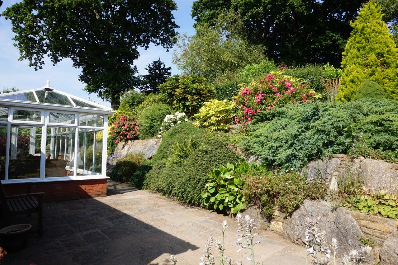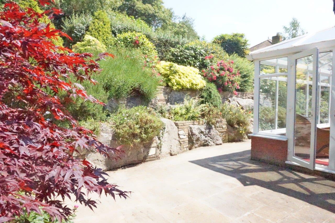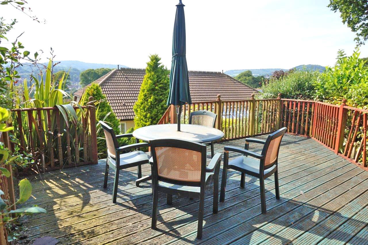 The property has split level gardens. To the front is a tarmac drive and a turning area providing plenty of parking. Mature shrub and hedge boundaries with raised shrub beds. A patio takes advantage of the south westerly aspect, with adjoining gravelled areas for low maintenance. The rear garden has been beautifully landscaped and is set out over two tiers, the lower giving access to the conservatory, and has a patio with well-maintained and well stocked shrub borders. Steps to either side lead to the upper tier, where there is an extensive and private decking area having superb views across the valley. This adjoins a SUMMERHOUSE with double doors and windows to three sides. Beyond the top boundary hedge is a further area of wild, overgrown garden that is gated. An active badger set is located here and is protected.
