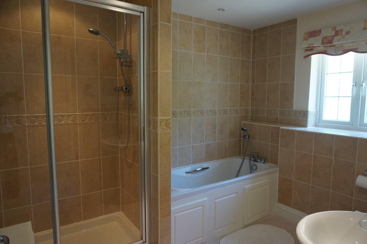 Obscure glazed uPVC window to the rear. A modern bathroom suite comprising a panelled bath with chrome hand grips and bath/shower mixer tap with hand held shower, low level WC pedestal wash basin and double shower cubicle with sliding door and chrome shower valve with hand held attachment. Fully tiled walls. Lino floor covering. Heated ladder style towel rail with TRV. Shaver point. Extractor.
