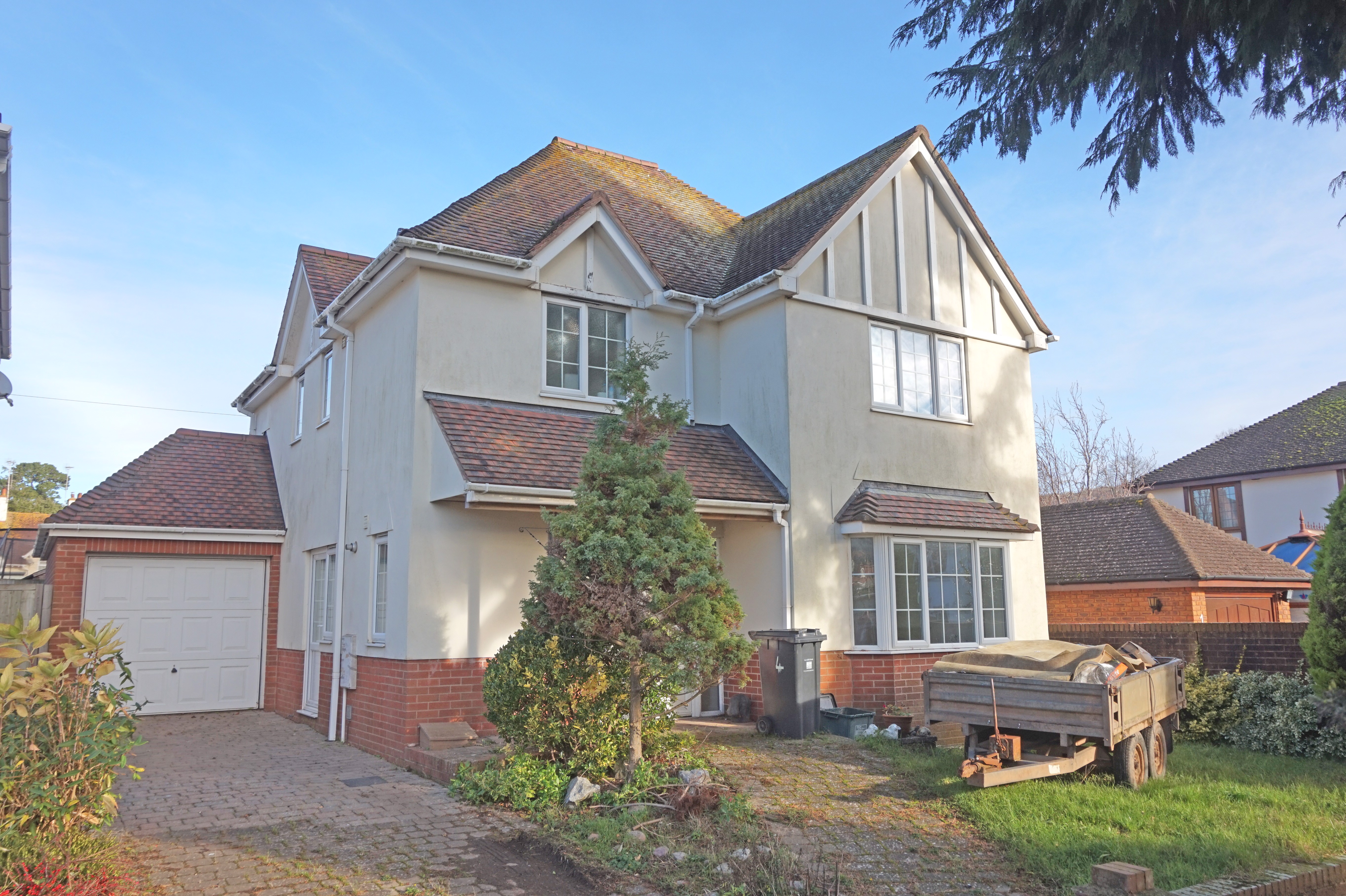 The rear is accessed from Sidford Road, where there is a gravelled driveway. At the front is a picket fence with a gate and paved footpath to the entrance porch, with an adjoining area of lawn and side gates providing access to the parking area and rear. The rear patio area is fully enclosed, a pedestrian gate, a patio area and outside tap and outside light.